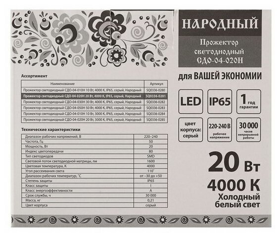 Ниже Вы можете прочитать отзывы на Прожектор LED 20Вт 4000К СДО-04-020Н IP65, серый, Народный TDM SQ0336-0281, ознакомится с подробными характеристиками, посмотреть интересные обзоры и фотографии на Прожектор LED 20Вт 4000К СДО-04-020Н IP65, серый, Народный TDM SQ0336-0281.