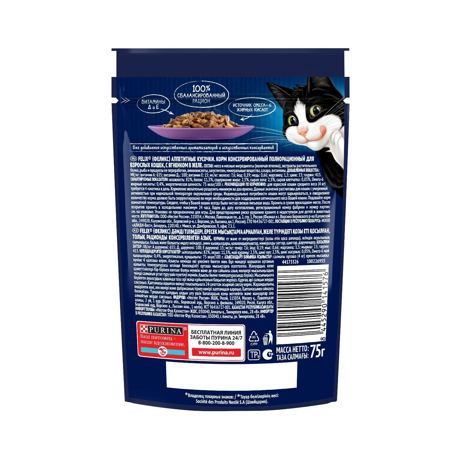 СохранитьFelix Аппетитные кусочки полнорационный влажный корм для кошек, с ягненком, кусочки в желе, в паучах - 75 г х 26 шт интересное: