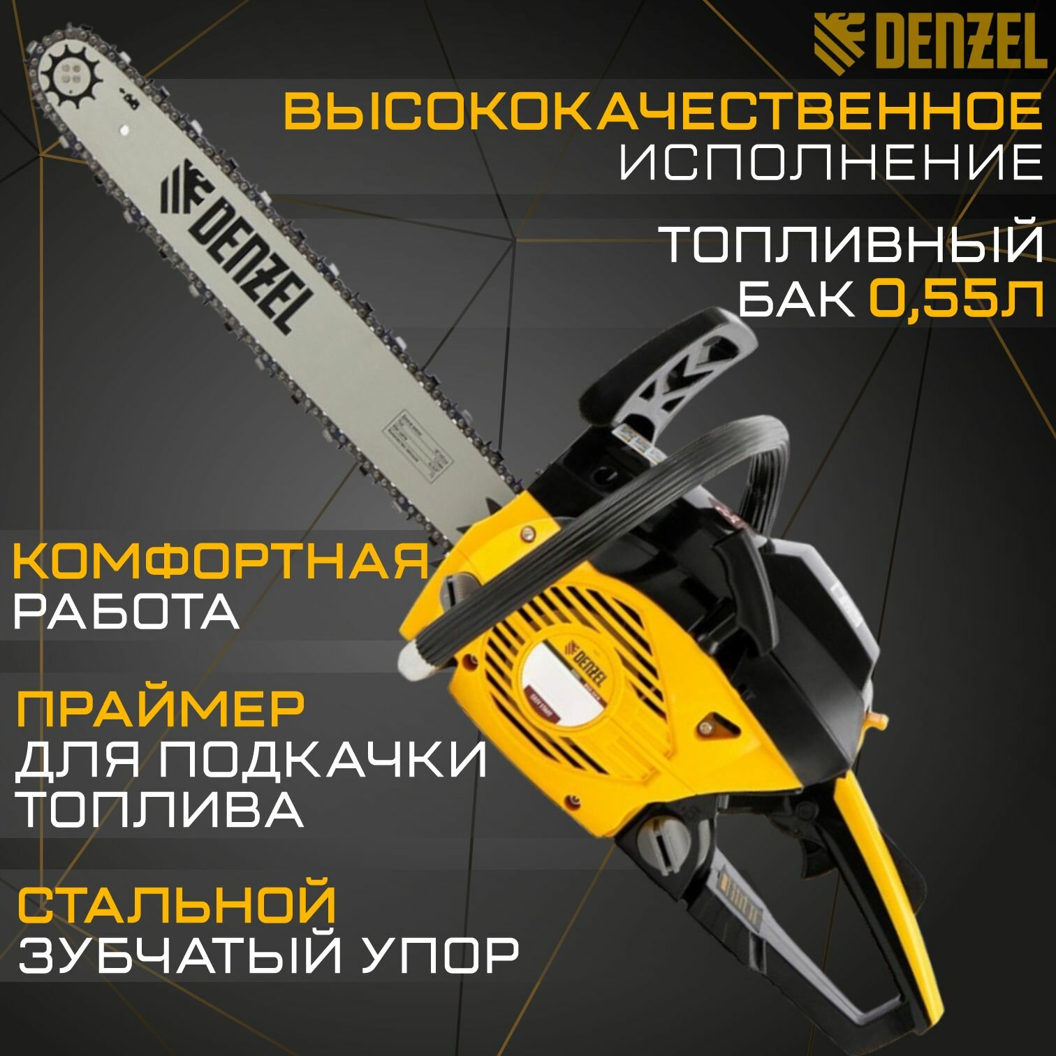 Пила цепная бензиновая DS-4516, шина 40 см, 45 см3, 2,5 л. с, шаг 0,325, паз 1,5 мм, 64 звена Denzel