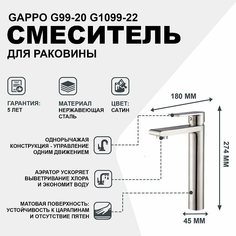 Ниже Вы можете прочитать отзывы на G1099-22 Смеситель для умывальника Gappo высокий, сатин, ознакомится с подробными характеристиками, посмотреть интересные обзоры и фотографии на G1099-22 Смеситель для умывальника Gappo высокий, сатин.