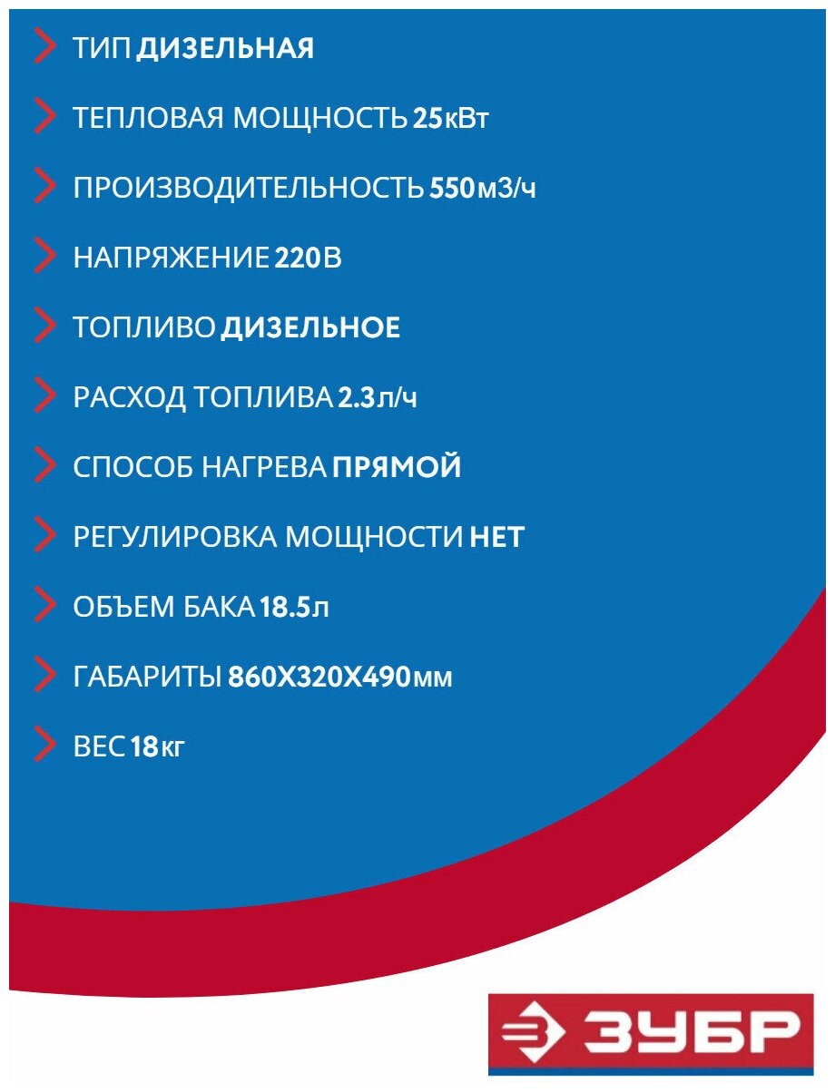 Купить ЗУБР 25 кВт, дизельная тепловая пушка, прямой нагрев (ДП-К8-25)