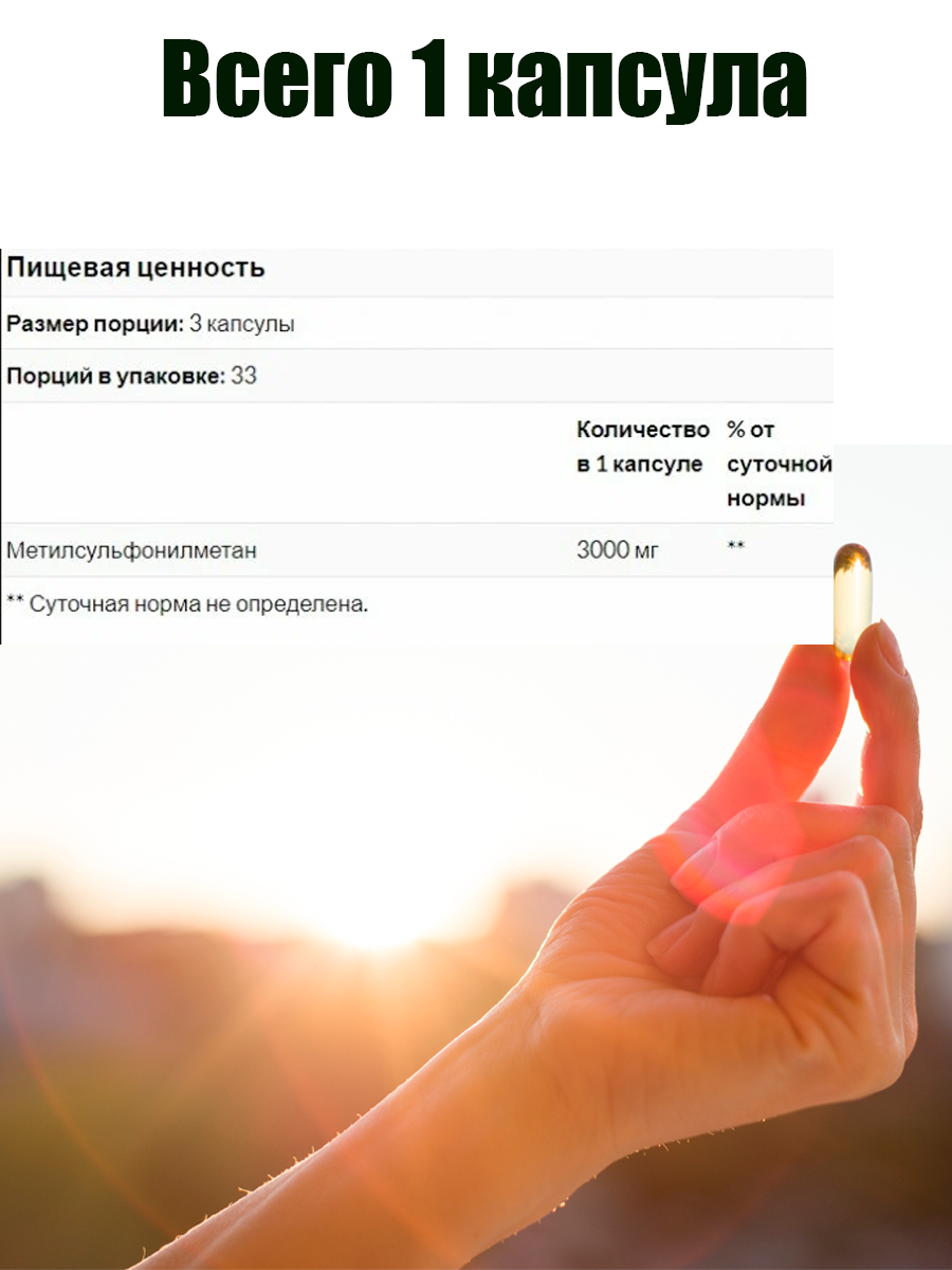 | Дополнительная информация | Перед применением внимательно изучите информацию на этикетке и строго следуйте рекомендациям. Принимать по 3 (три) капсулы один или два раза в день или в соответствии с назначениями врача; рекомендации по применению: формула МСМ способствует комфорту суставов после тренировки, сохранению подвижности и нормальной работе суставов, а также помогает минимизировать проявления окислительного стресса; состав: Желатин, растительный стеарат.; энергетическая ценность на 100 г: Хранить в недоступном для детей месте. Не следует превышать рекомендуемую дозировку. Не следует приобретать продукт, если наружная защитная пленка повреждена. Проконсультируйтесь с врачом перед применением пищевых добавок, если вы проходите курс лечения от какого-либо заболевания, а также в период беременности и лактации. Хранить в плотно закрытой упаковке в сухом и прохладном месте. |