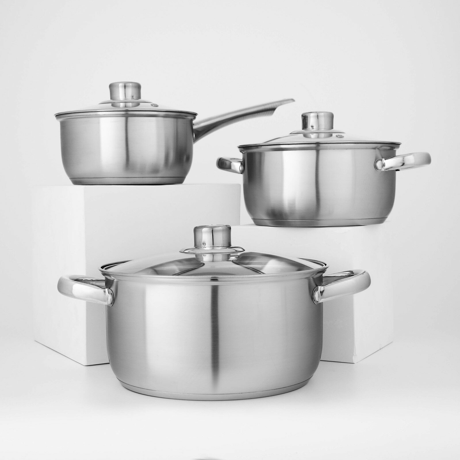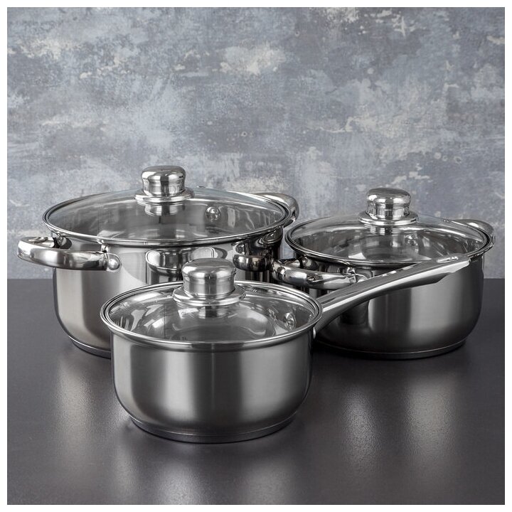 Купить Набор посуды из нержавеющей стали Доляна «Гретте», 3 предмета: сотейник 1,5 л, d=16 см, кастрюли 2 л, 4 л, d=18 см, d=22 см, крышки