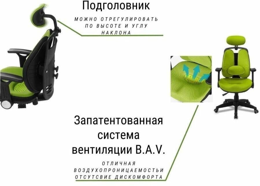 | Функциональные особенности | Основание с пятилучевой крестовиной, бесшумные ролики, поясничный валик, сидения с системой вентиляции BAV, сиденье и спинка анатомической формы |