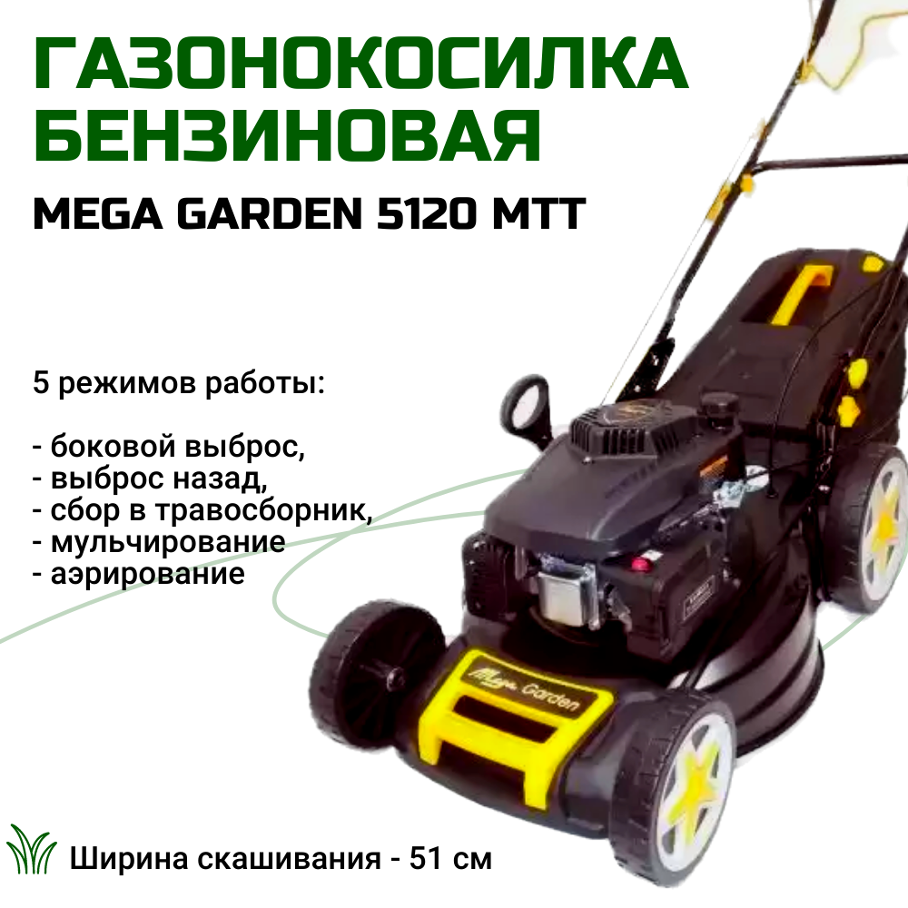Газонокосилка бензиновая MegaGarden 5120 MTT самоходная 5в1 интересное: