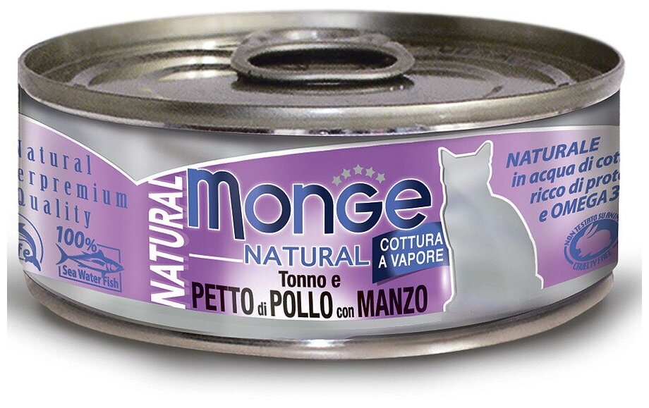 Влажный корм Monge Cat Natural для кошек, из тунца с курицей и говядиной, консервы 80 г