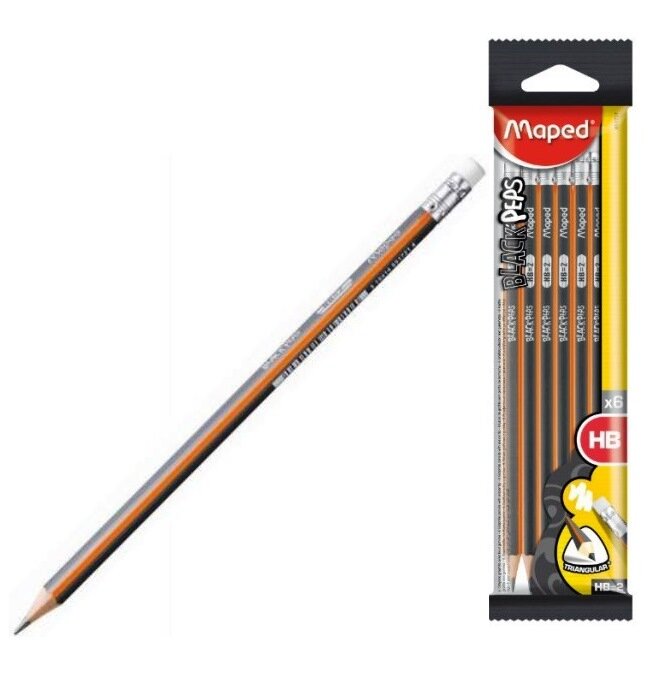 Карандаш чернографитовый MAPED BLACK PEP'S HB, с ластиком, треугольный, в блистере, 6шт/уп