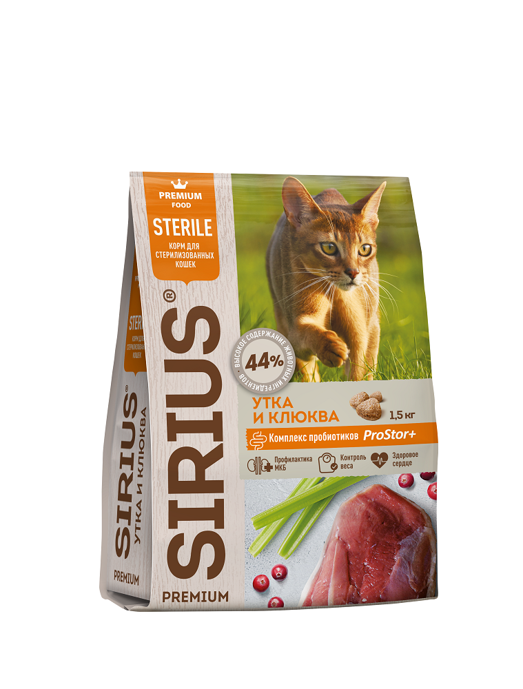 Сухой корм сириус SIRIUS PREMIUM для стерилизованных кошек, утка и клюква, 1.5 кг
