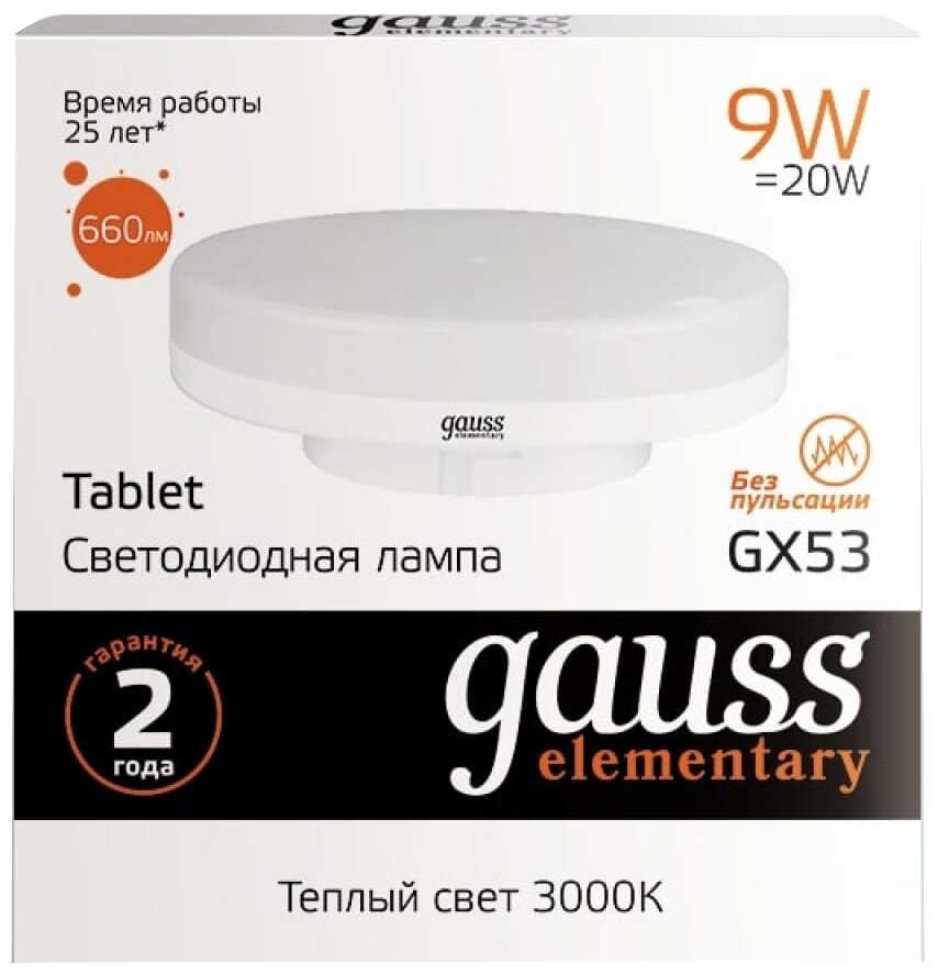 Лампа светодиодная LED 9 Вт 660 Лм 3000К теплая GX53 таблетка Elementary Gauss (упаковка 2 шт)
