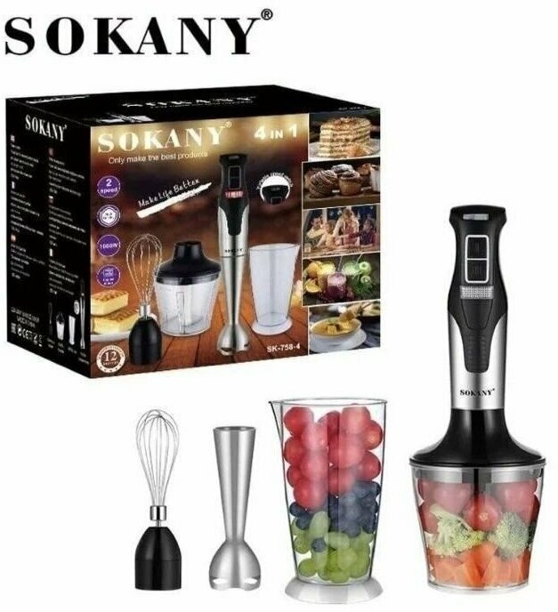 Многофункциональный блендер HEALTHY FOOD/Погружной высокопрочный блендер 4/1 /с мощностью 1000 Вт/SOKANY SK-758-4
