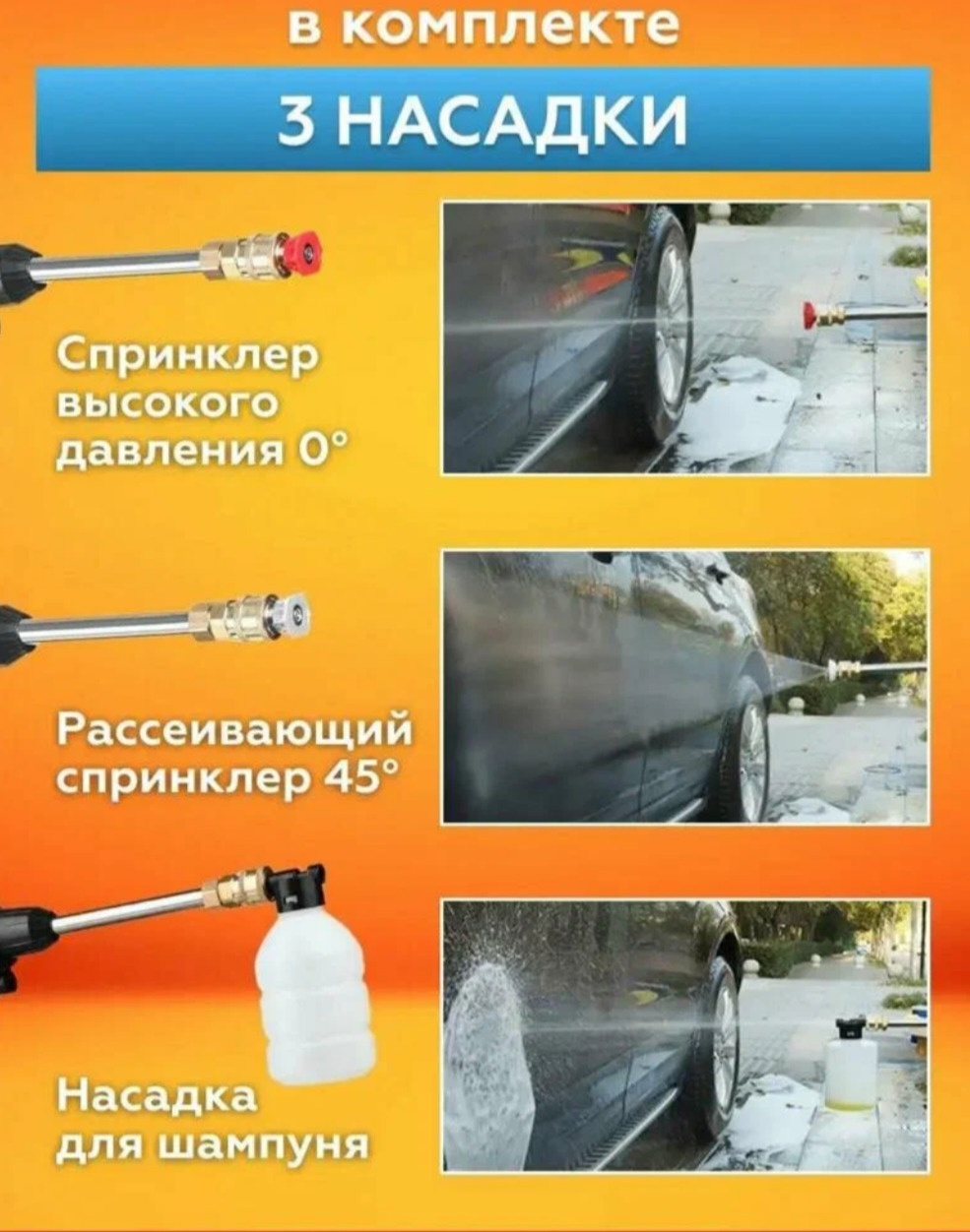 | Насадки | веерная насадка / грязевая фреза / пеногенератор / пескоструйная насадка |