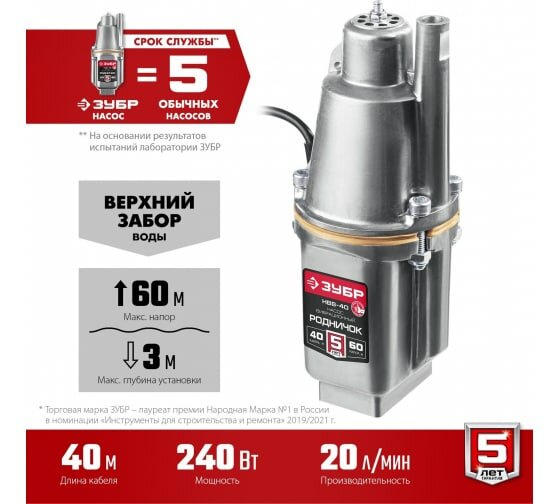 Вибрационный насос с нижним забором воды ЗУБР Родничок-Н кабель 15 м НВН-15 подарок на день рождения мужчине, любимому, папе, дедушке, парню