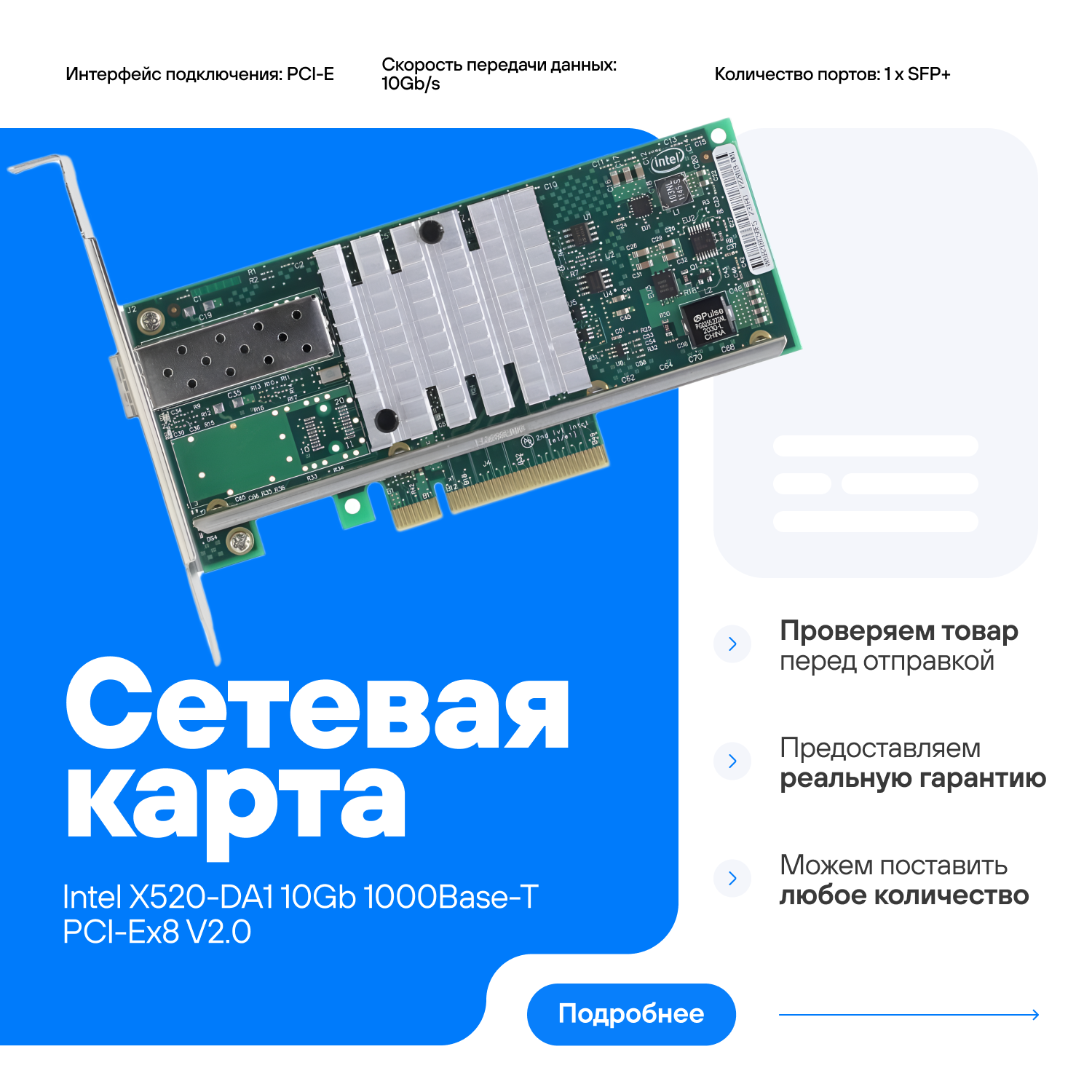 Ниже Вы можете прочитать отзывы на Сетевая карта Intel X520-DA1 1xSFP+ 10 Gb/s 82599ES, ознакомится с подробными характеристиками, посмотреть интересные обзоры и фотографии на Сетевая карта Intel X520-DA1 1xSFP+ 10 Gb/s 82599ES.