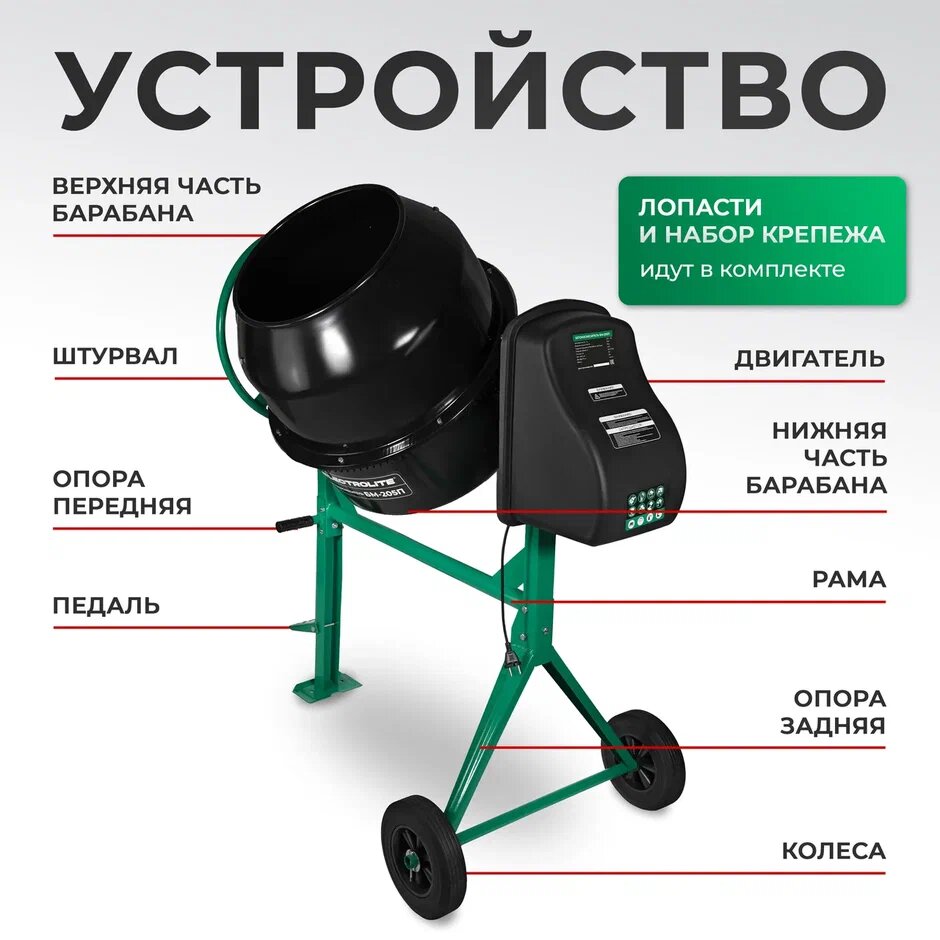 Бетоносмеситель строительный / Циклическая бетономешалка электрическая Electrolite БМ-205П (1100 Вт, 205 л, педаль, чугунный венец) интересное: