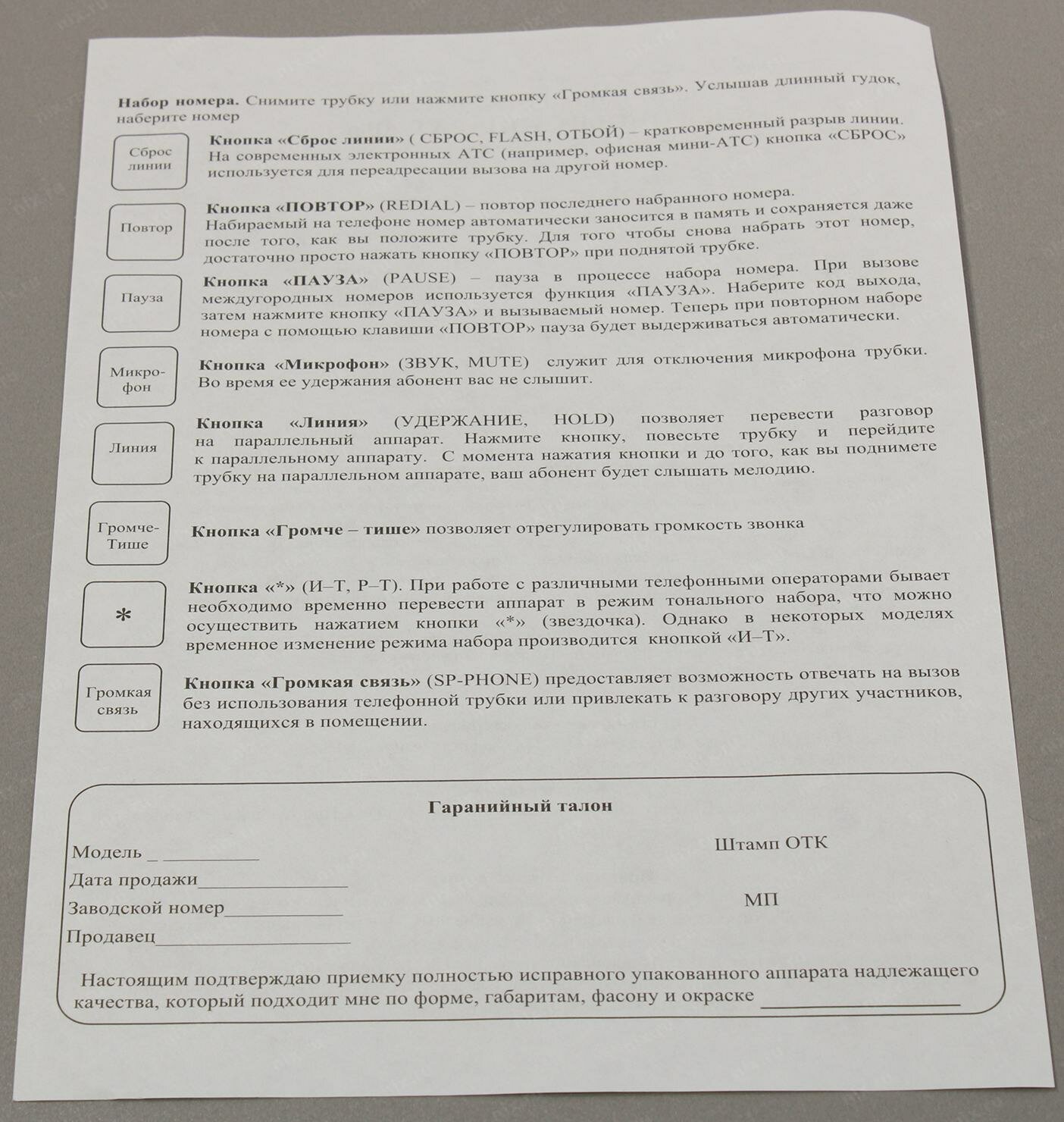 | Особенности | кнопка выключения микрофона, повторный набор номера, регулятор громкости звонка |