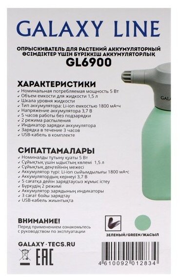 Опрыскиватель для растений аккумуляторный GALAXY LINE GL6900/зеленый