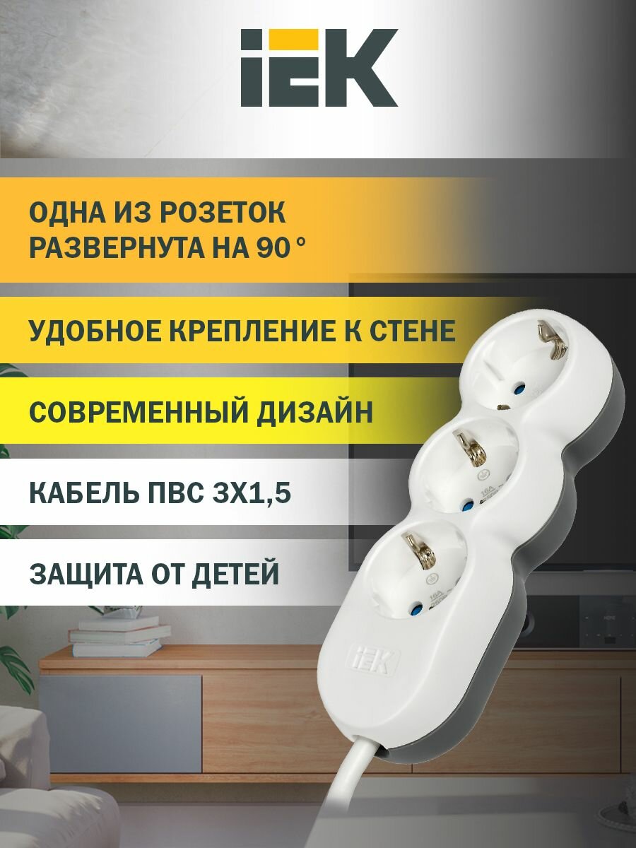 Удлинитель IEK WYP53-16-05-D15-ZK, 5 розеток, 1.5 м, с/з, 16А / 3500 Вт белый