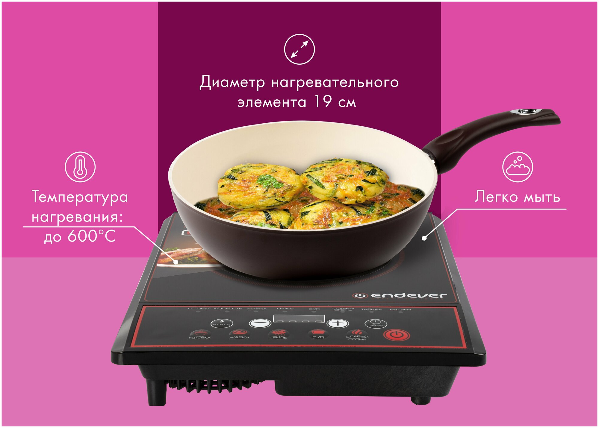 Быстро греется, компактная. Мощность, хоть и меньше заявленной, но все равно ее достаточно для любой готовки. В целом довольна покупкой.