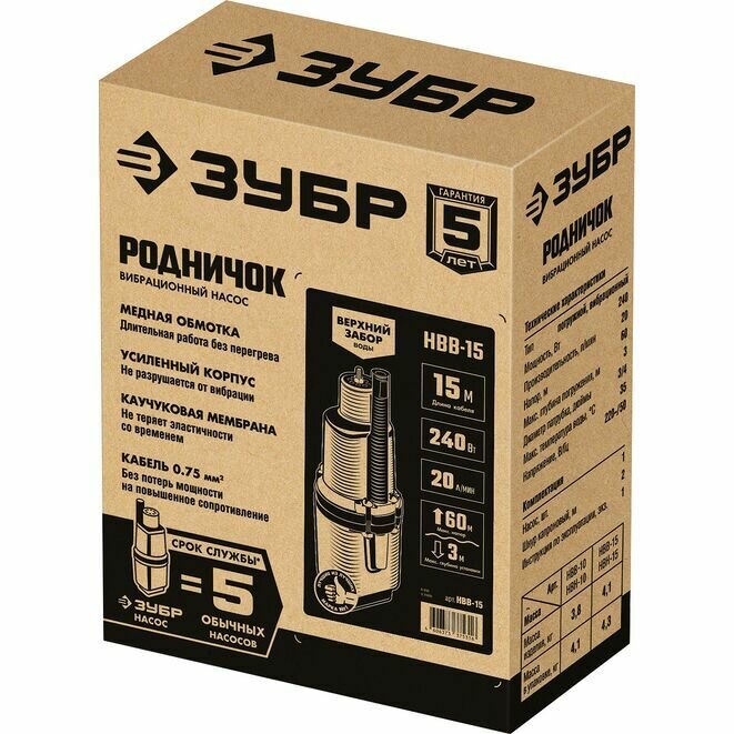 Насос вибрационный Зубр НВВ-15, 240 Вт, верхний забор, 1200 л/час, кабель 15 м