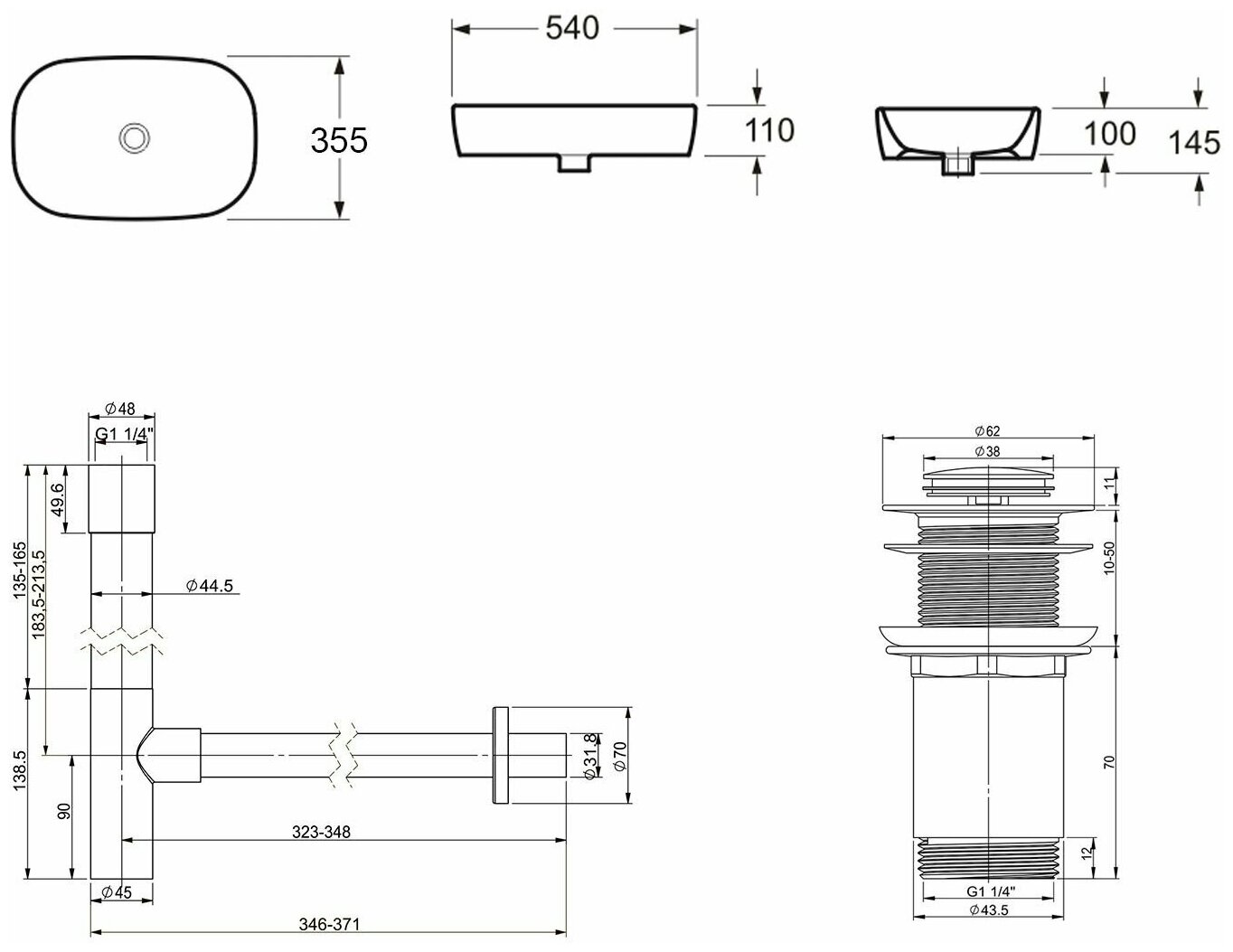 Комплект 3 в 1 Lavinia Boho Bathroom Sink 21520031: накладная фарфоровая раковина 54 см, металлический сифон, донный клапан