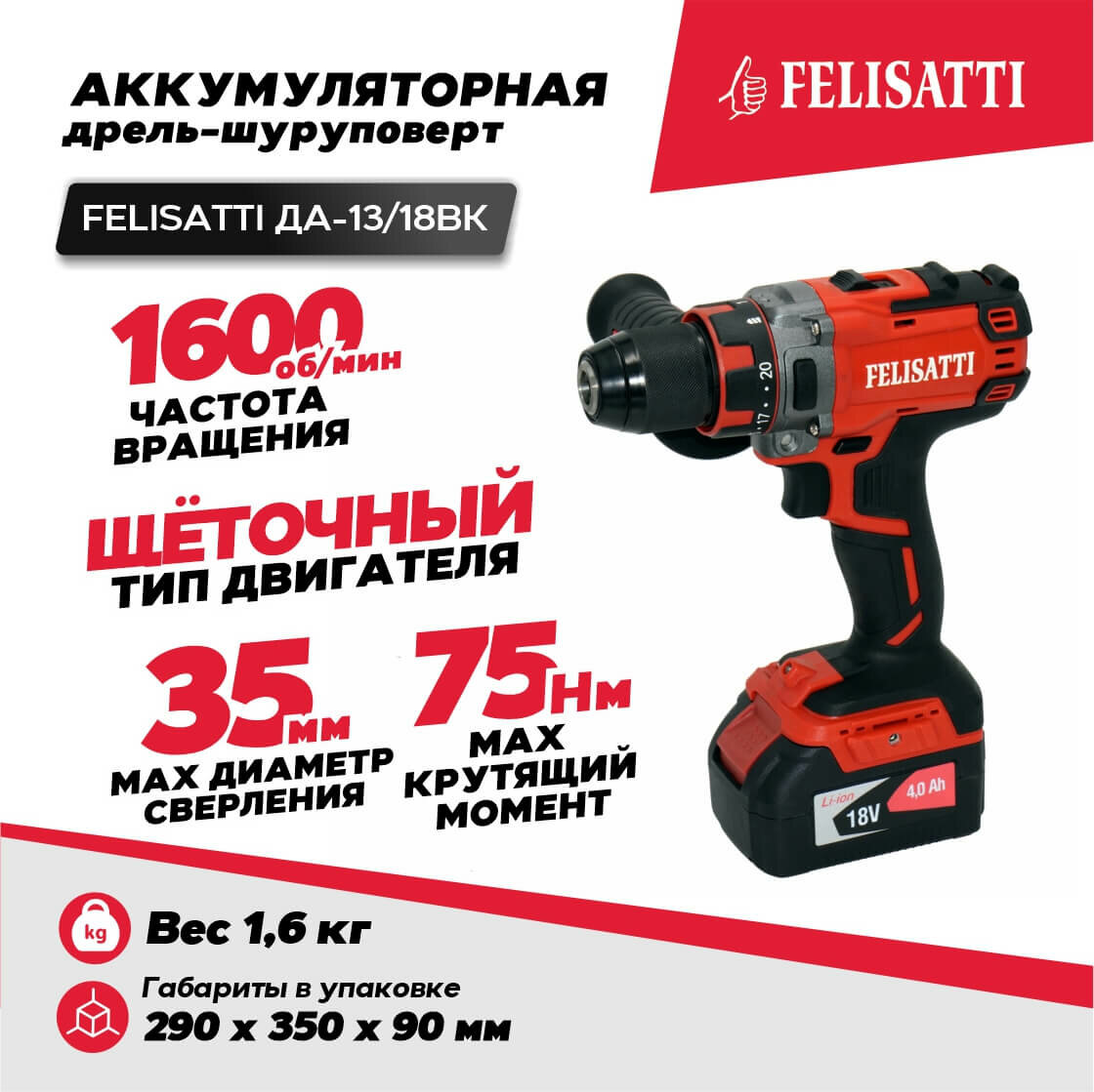 ДА-13/18BK аккумуляторная дрель-шуруповерт Li-Ion 75Н.м. (бесщеточный)((1 аккум. 4ач и ЗУ) FELISATTI, шт FELISATTI