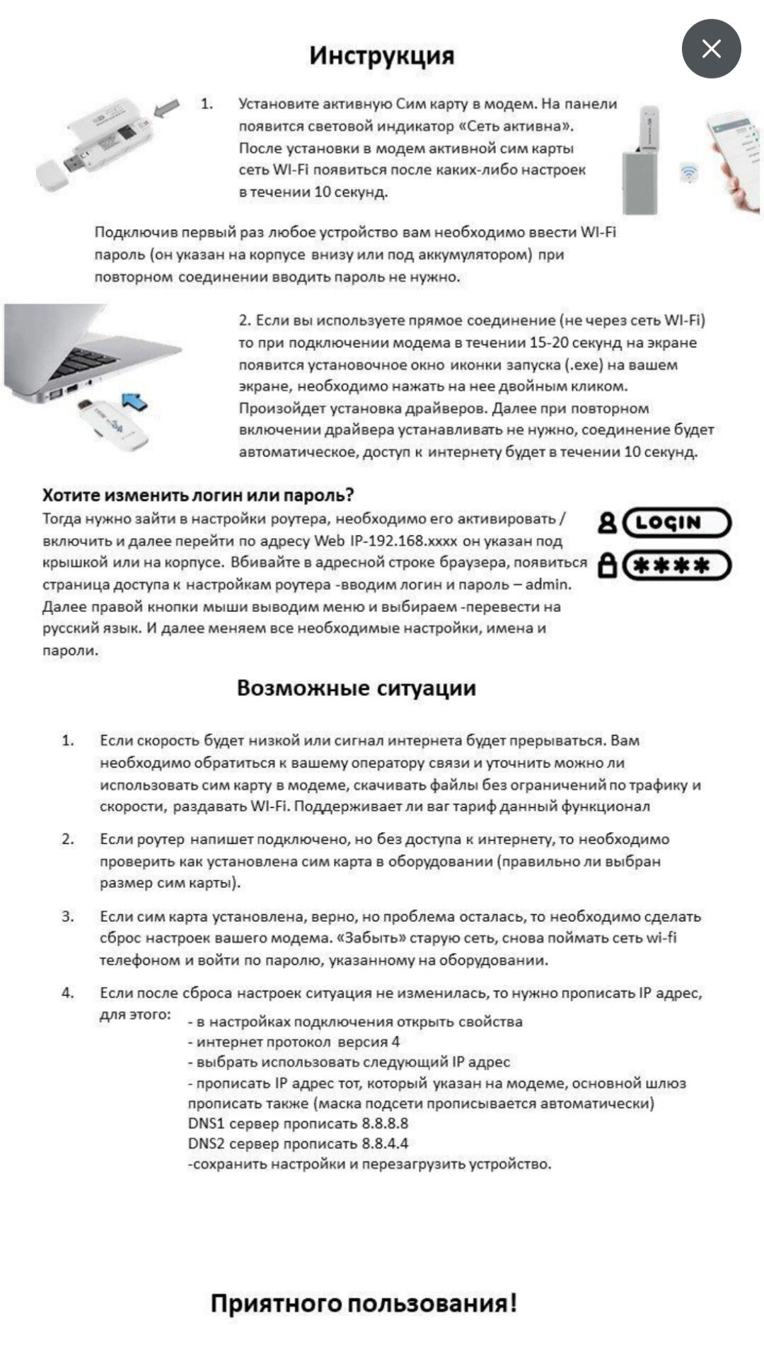 | Дополнительная информация | Беспроводной модем можно использовать как напрямую подключив к ноутбуку или компьютеру, так же через блок питания для раздачи интернета и даже подключить к магнитоле |