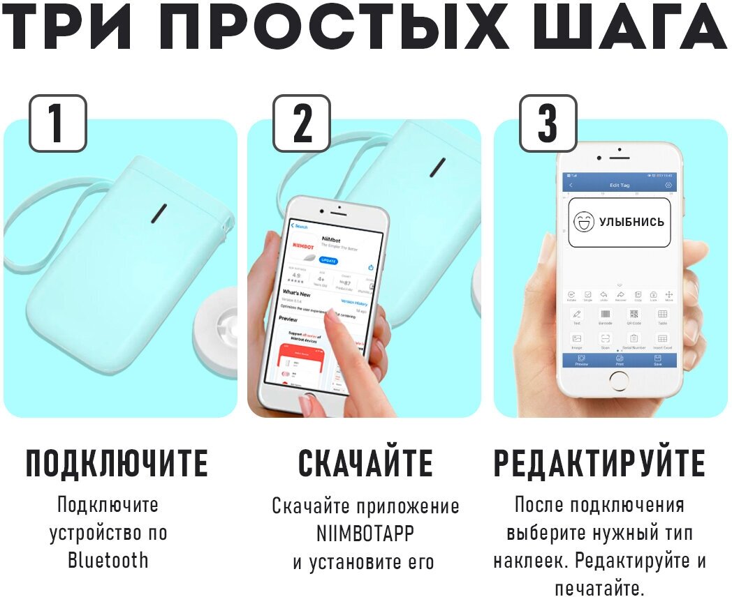 Термопринтер NIIMBOT D11 (1500мА/ч) белый. Печать: Наклейки, стикеры, этикетки, ценники, бирки, QR коды, честный знак.