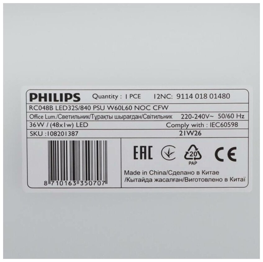 PHILIPS Светильник светодиодный RC048B LED32S/840 PSU W60L60 NOCCFW панель 911401801480