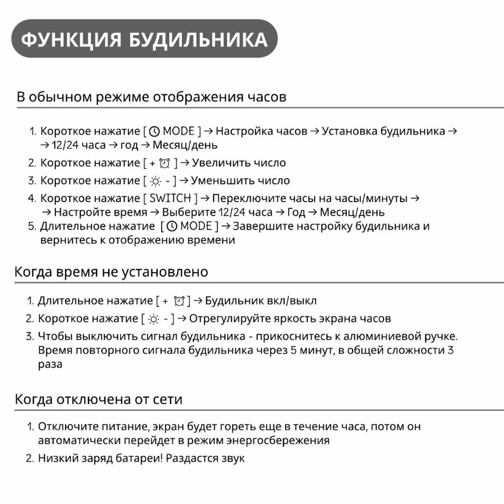 Утром как только открыл глаза не нужно присматриваться сколько времени очень хорошо видно цифры. Подсветка с регулировкой яркости можно использовать как ночник. Радио. Работает от собственной батареи хватает на долго можно взять с собой куда угодно. Можно использовать как блютуз колонку и слушать музыку с телефона. Провод для зарядки в комплекте. |
