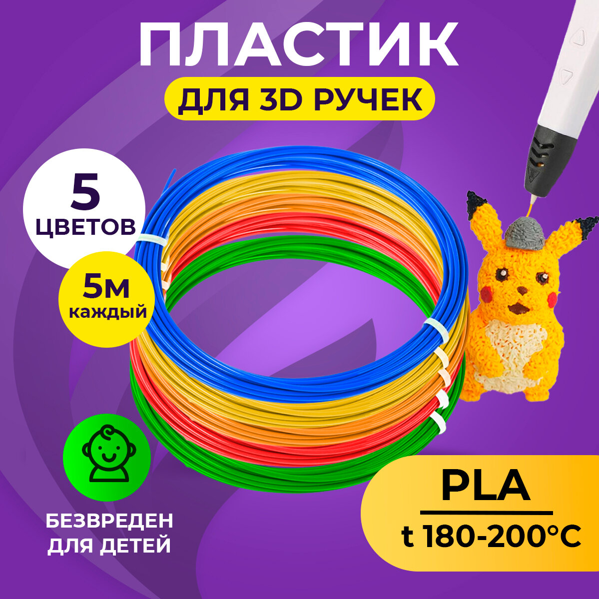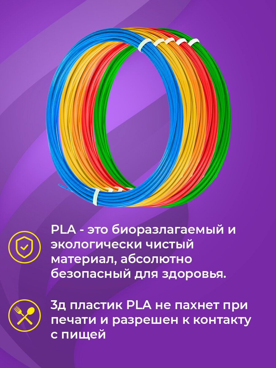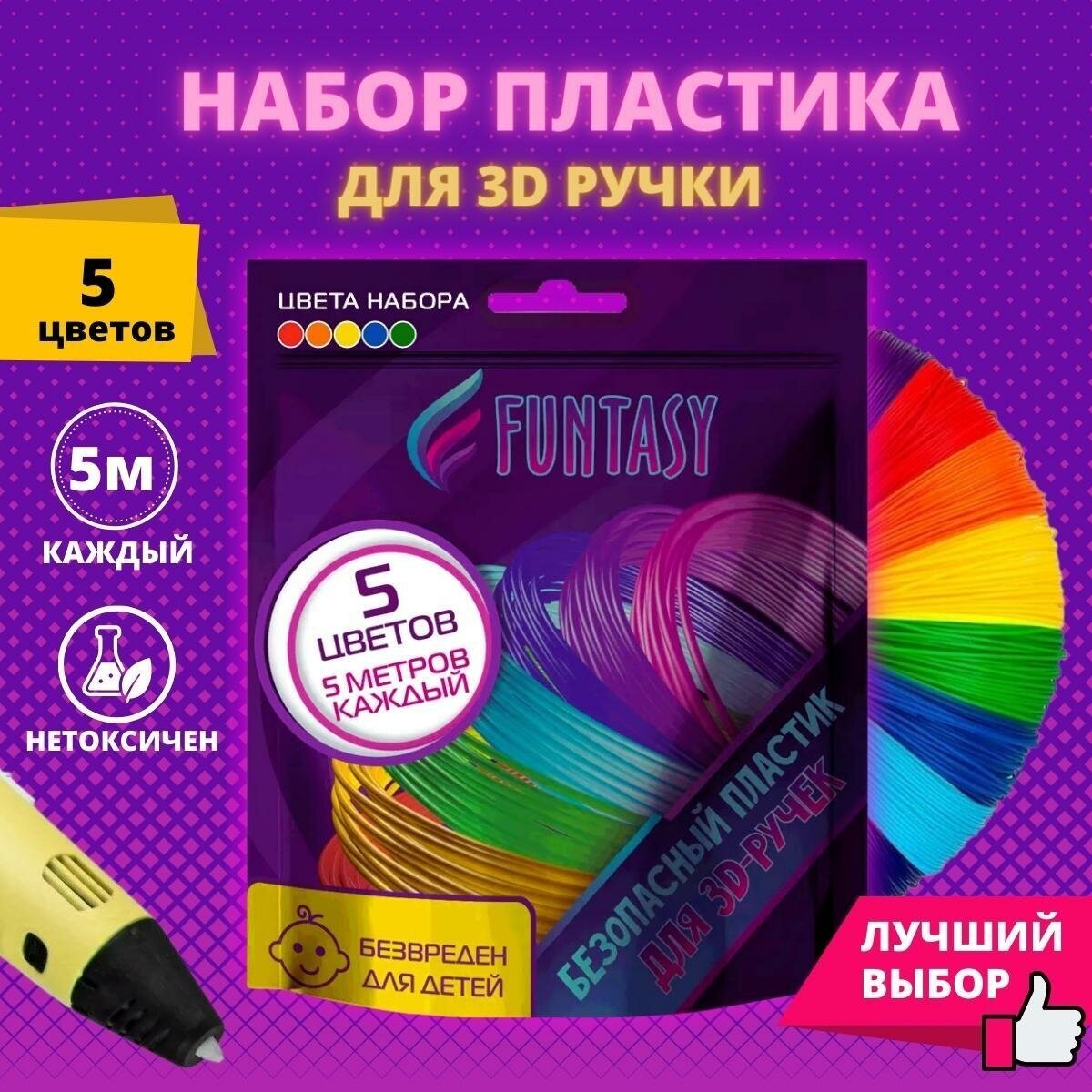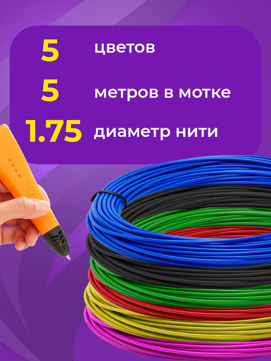 Пластик для 3D ручки 5 цветов Funtasy (для 3д ручки), 5 цветов по 5 метров Набор безопасного пластика без запаха для детей/Пластик для 3d ручки pla/Цвета для 3д ручки/Леска пластмасса для 3 д ручки/Картриджи для 3 d ручки/Подарок на День рождения ребенку интересное: