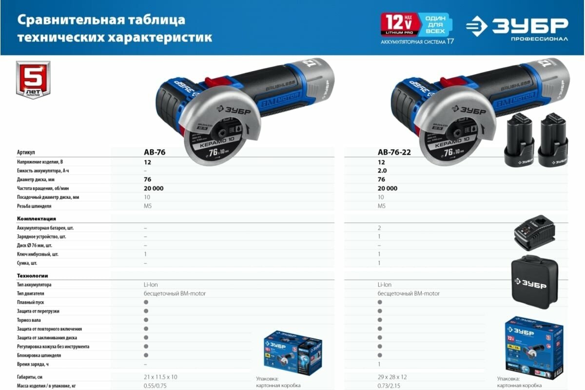 ЗУБР 12В бесщеточная, без АКБ, в коробке, углошлифовальная машина AB-76 Профессионал