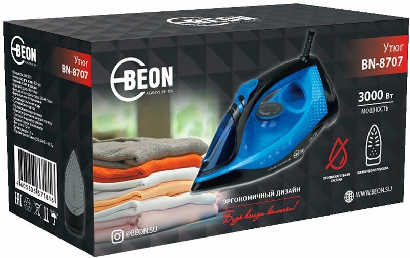 Утюг электрический BEON BN-8707, 3000Вт, подошва керамика, самоочистка, антикапля, резервуар 320мл интересное: