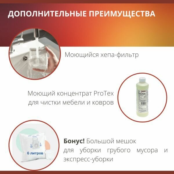 | Дополнительная информация | сумка для принадлежностей; емкость резервуара моющего средства 1.8л; радиус действия 12м; объем всасываемой воды в режиме сбора… жидкостей 2 литра; моющий концентрат для ковров ProTex 500 мл; фильтр-мешок на 6 литров ещёскрыть |