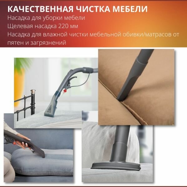 | Плюсы: | Потрясающая мощность всасывания, великолепно моет ковры и мягкую мебель |