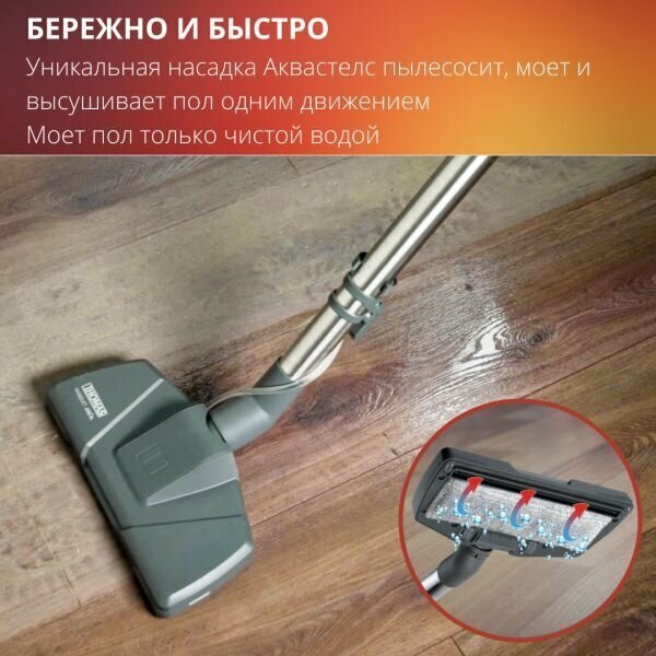 Пылесос удобный, мощный, весит немало (8 кг в полной оснастке), но катится легко. У аквафильтра есть ручка для переноски и накладка против разбрызгивания, удобно. Очень мне понравилась ступенчатая педаль включения с индикатором: чем дольше давишь, тем больше мощность, и это видно. Полезным показался режим сухой уборки через аквафильтр – воздух остается свежим и пылесос не так противно очищать, как с простым мешком. Впечатлила насадка для влажной уборки паркетных полов AQUA Stealth. На нее крепишь на липучке специальную салфетку из микроволокна, а дальше как в рекламе: провел щеткой туда, провел обратно и полоса блестит. И еще понравилось пылесосить диван и кресла турбонасадкой для мягкой мебели, быстро и такое ощущение, что пыль высасывается из глубины мебели. Единственно, я боялась не разобраться в подключениях-фильтрах, но пылесос сконструирован как разъемы в компьютере: не туда просто не воткнешь. Так что могу смело рекомендовать, тем более, что цена для такой модели вполне умеренная |