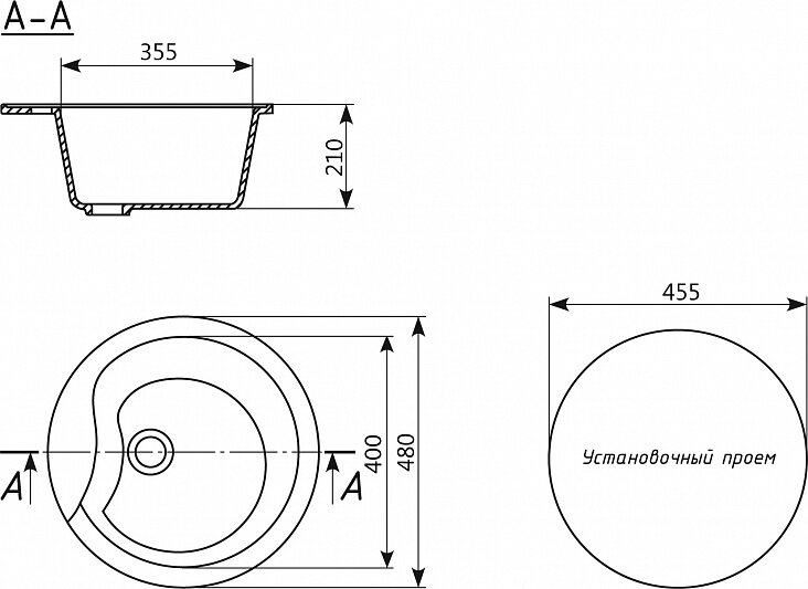 Мойка кухонная Ulgran из искусственного мрамора круглая U-102, цвет: ультра-черный, база: 45.5х45.5 см, арт. U-102-344