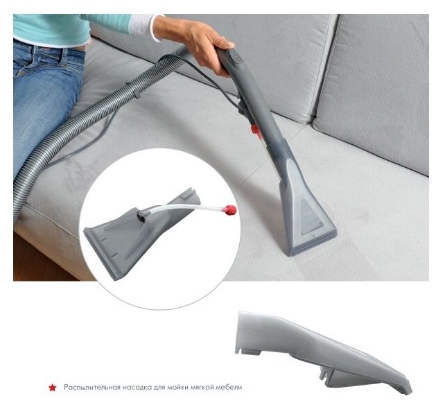 | Насадки в комплекте | пол/ковер, щелевая, насадка для обивки мягкой мебели, моющая насадка для ковров с адаптером для твердых поверхностей, моющая насадка для мягкой мебели |