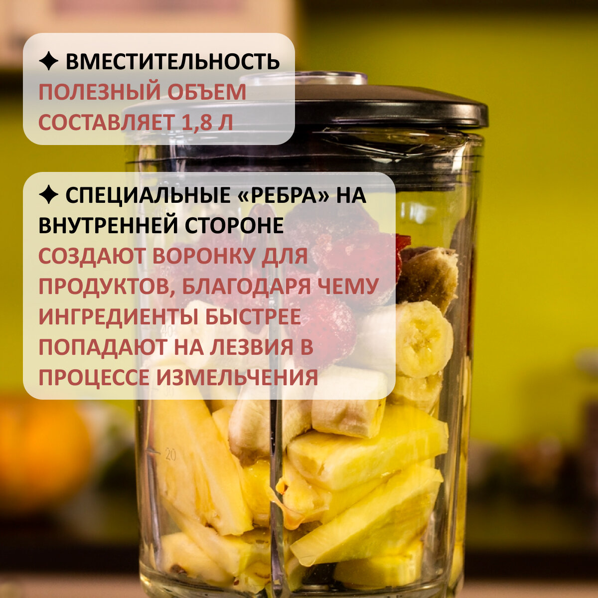 Стакан из толстого стекла сделан, сто процентов лучше чем пластик, не красится. Есть несколько режимов в нём, но я пользуюсь только тем, что подкидываю продукт (Импульсно), когда их слишком много. А бывает, что чашу заполняю больше чем на половину. |
