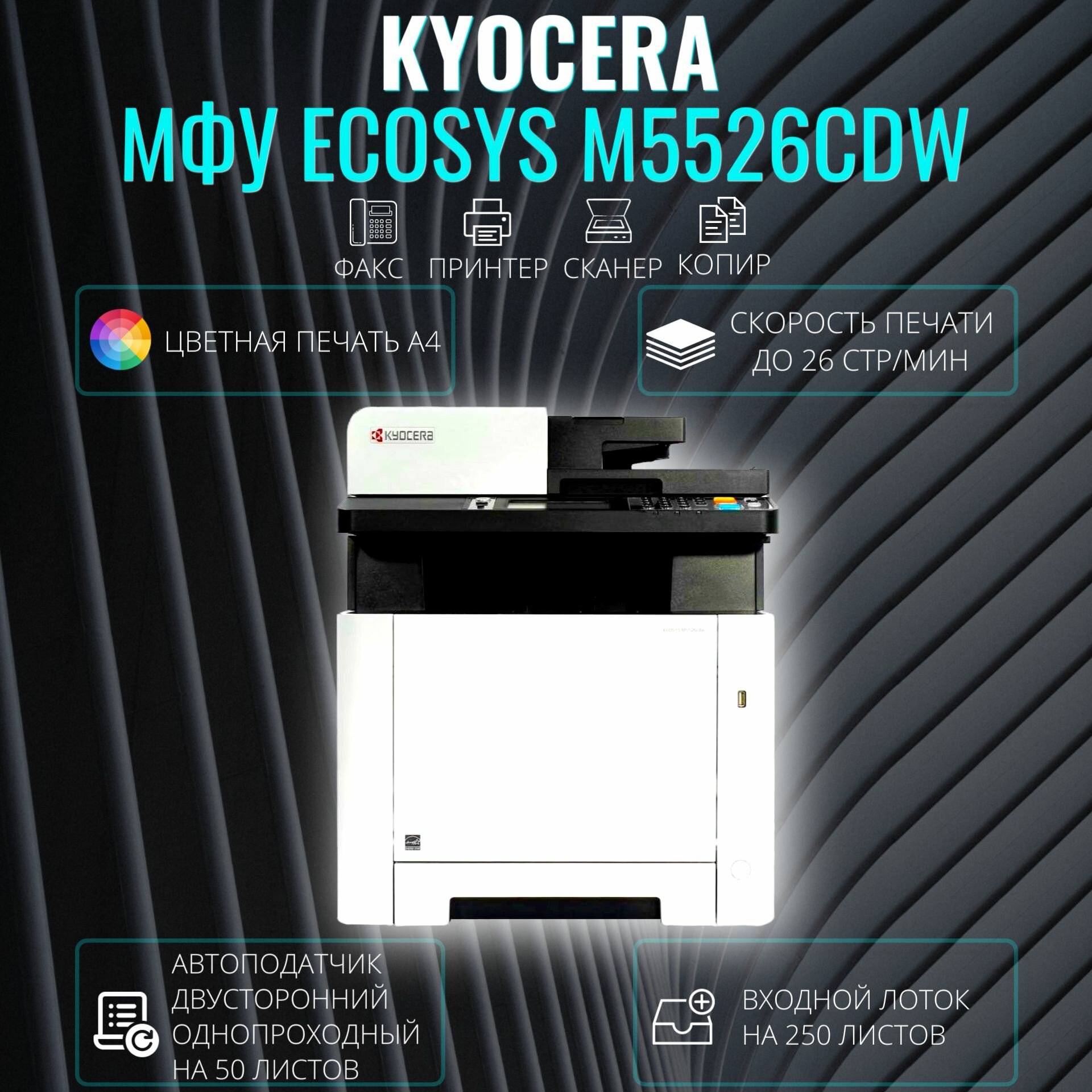 Kyocera M5526cdw (МФУ цветное лазерное P/C/S/F, A4, 26 стр/мин, 1200x1200 dpi, 512 Мб, USB 2.0, Network, Wi-Fi, лоток 250 л., Duplex, автопод.) (036594)