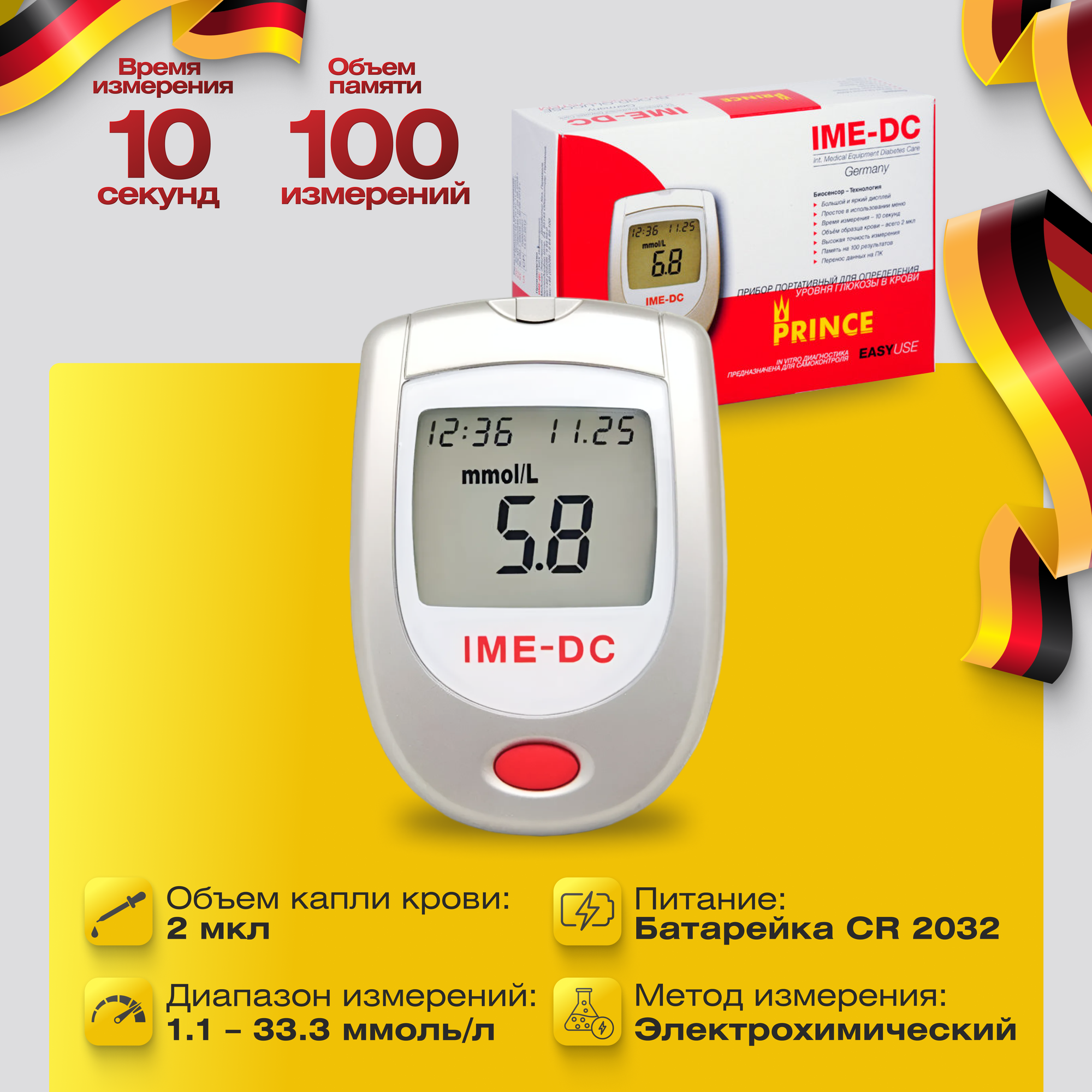 Глюкометр (Прибор портативный для определения уровня глюкозы в крови IME-DC PRINCE)+Тест-полоски IME-DC PRINCE №50х2