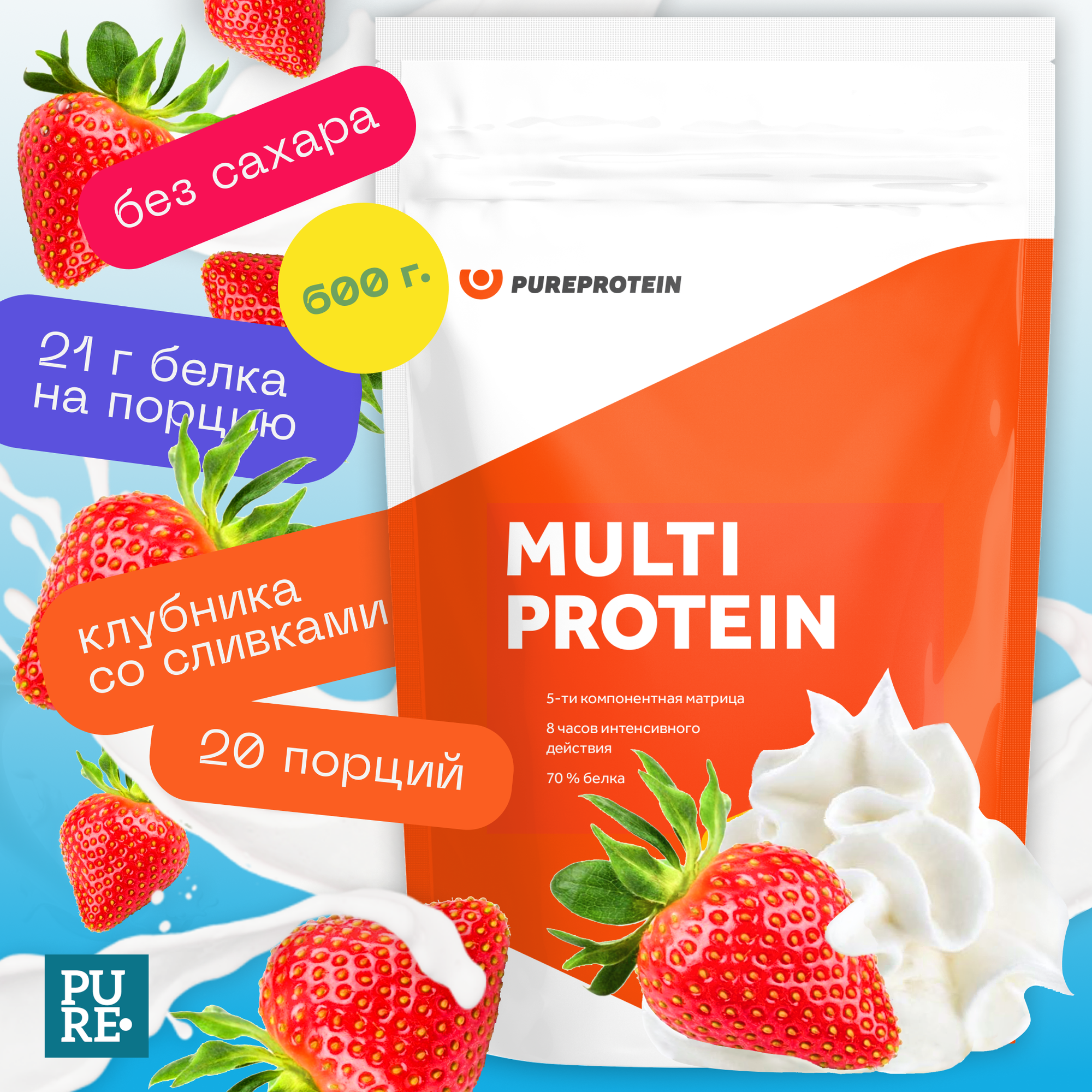Купить Мультикомпонентный протеин "Клубника со сливками" Pure Protein 600 г
