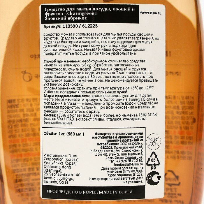 Lion CHARMGREEN 500 гр. bottle Средство для мытья посуды, овощей и фруктов (Японский абрикос)