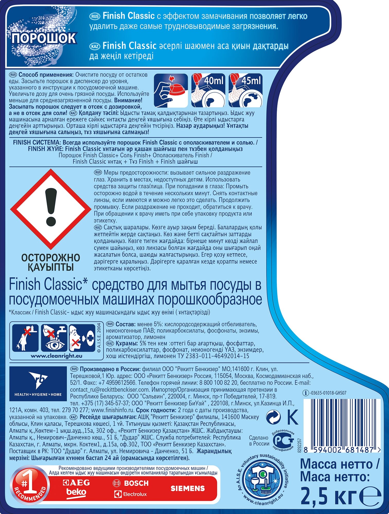 Порошок белый, без комков. Экологичность не проверяли. PS. Мы раньше (лет ~7) покупали тот же Finish Classic из известного "деревенского" сетевого магазина в соседней стране. Он был в большой коробке 3 кг, приятная цена, отличное качество. "Но все проходит в жизни зыбкой..." |