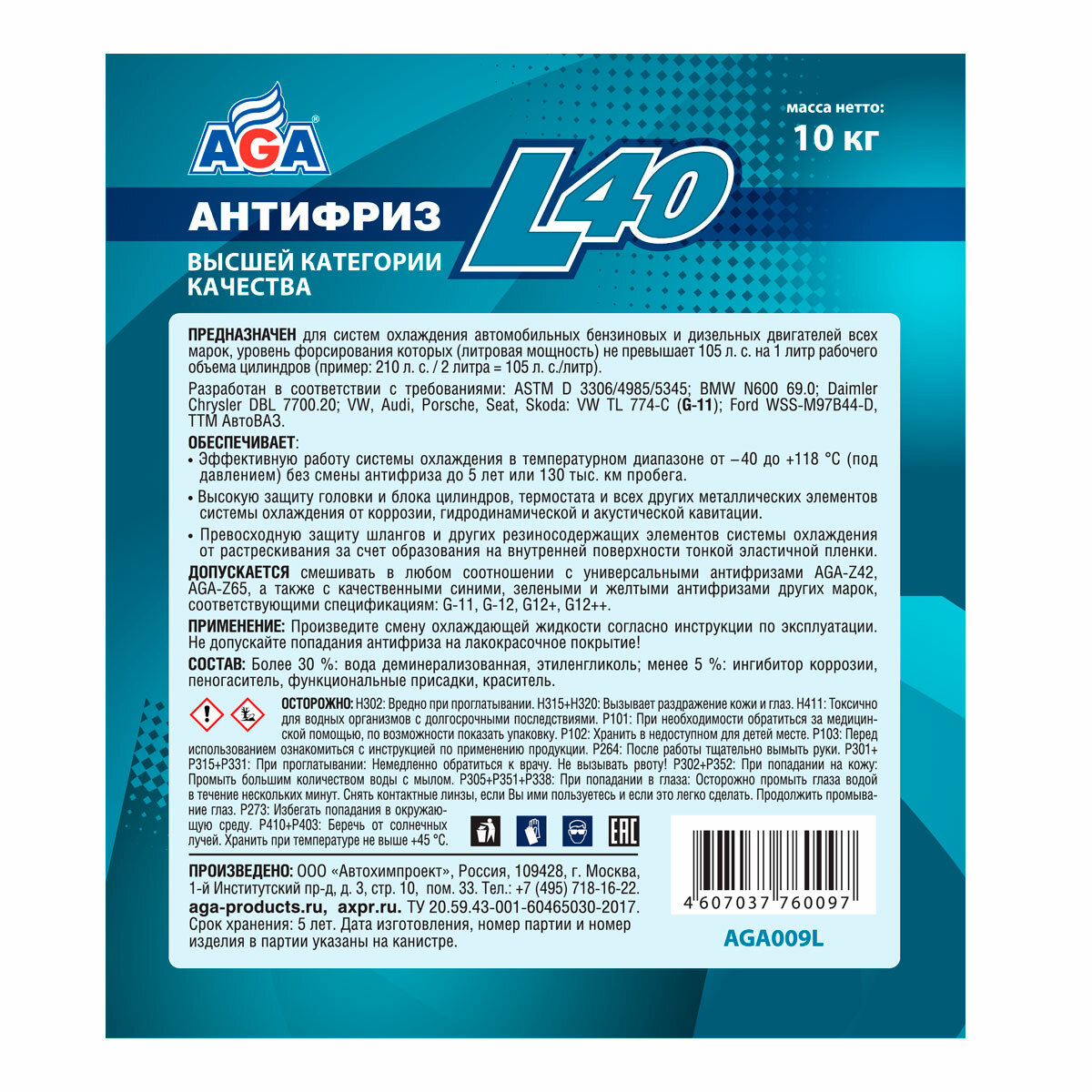 AGA AGA009L Антифриз AGA-L40, готовый к применению, сине-зеленый, G-11, 10 кг