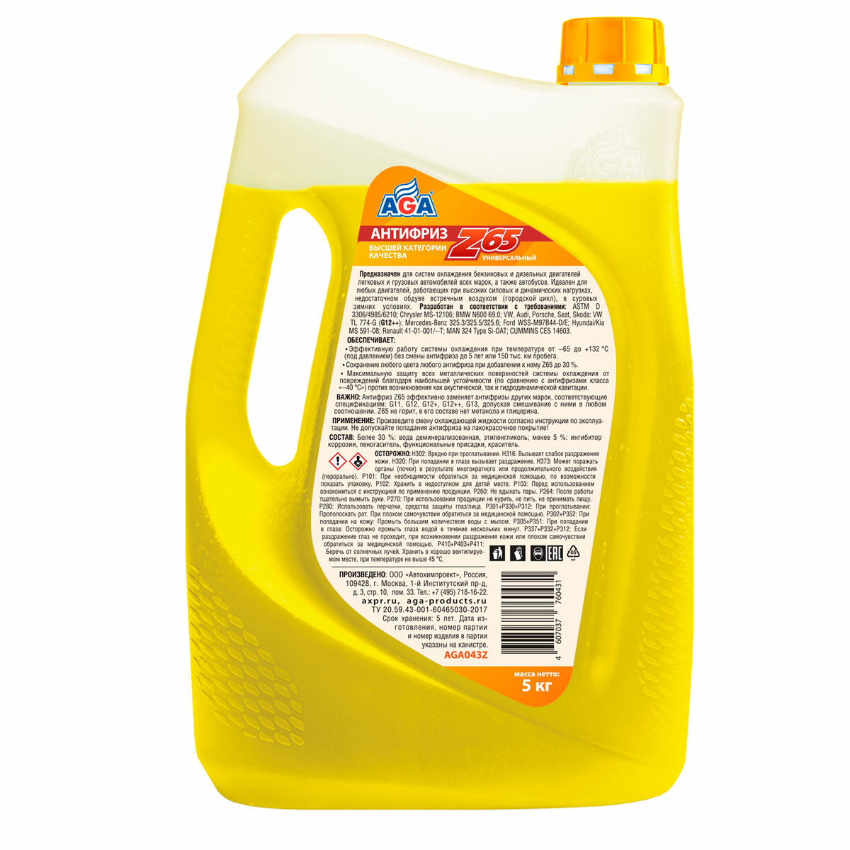 Антифриз Aga Z-65 Желтый -65С G12+ 5Л AGA арт. AGA043Z