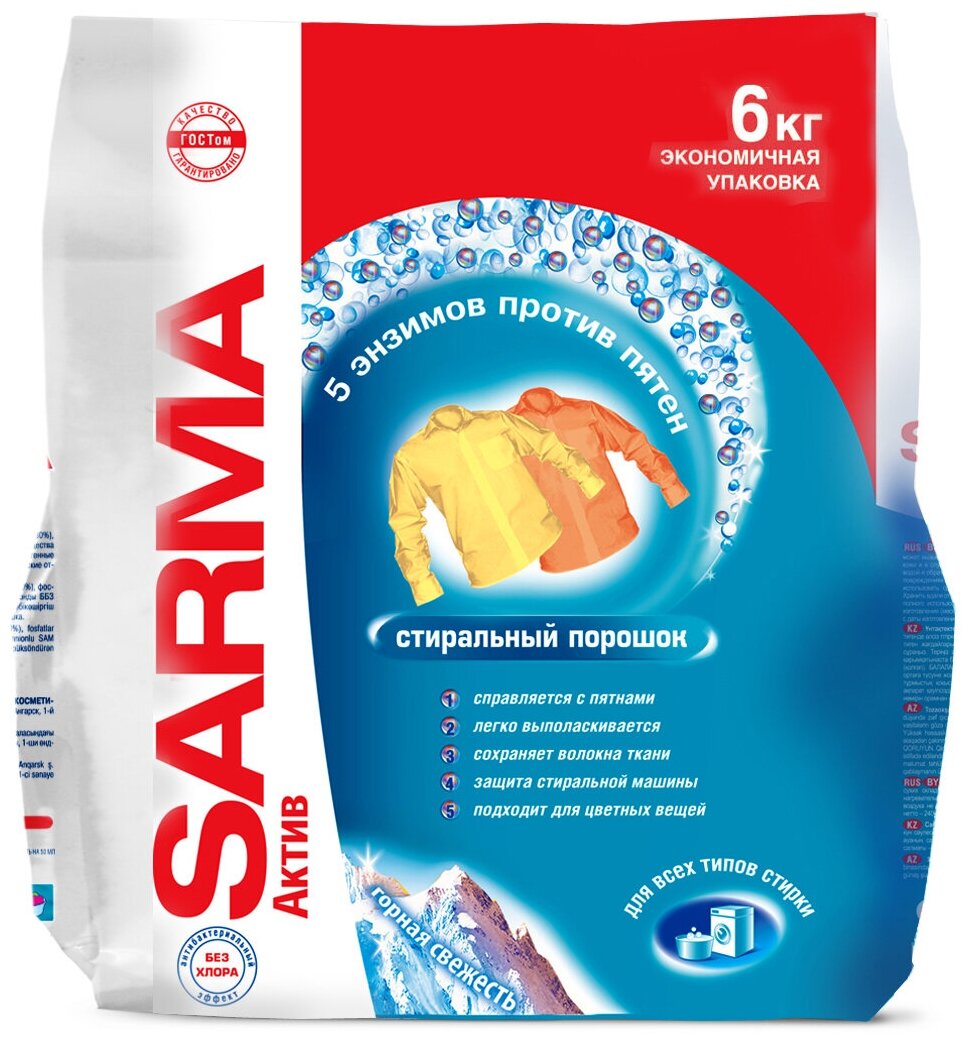 Порошок стиральный SARMA Актив для любого вида белья аромат горная свежесть для всех типов стирки 6кг / моющее средство