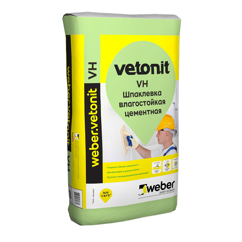 Вебер.ветонит ВХ шпатлевка цементная влагостойкая/Шпаклевка цементная Weber.vetonit VH для влажных помещений белая 20 кг