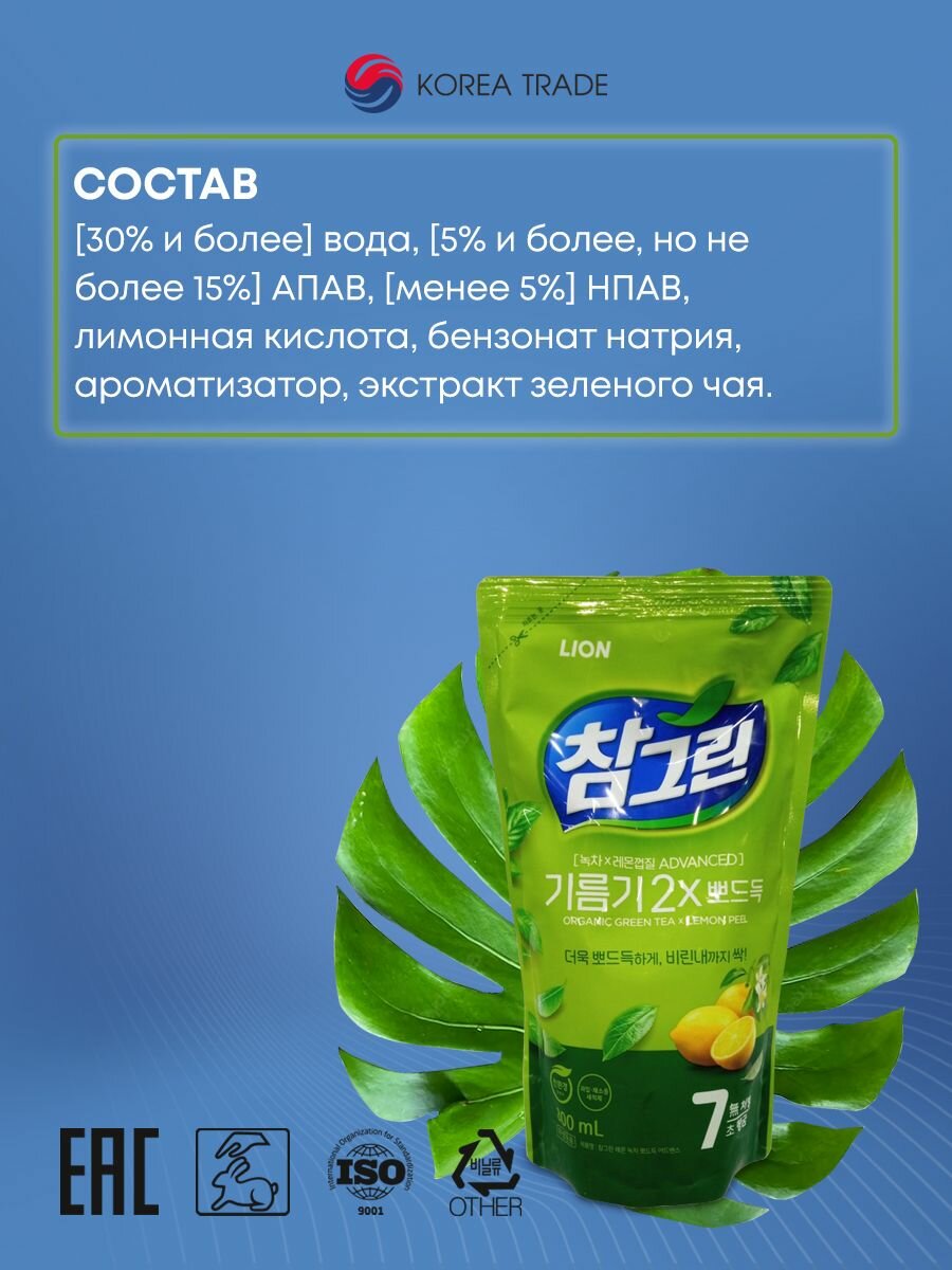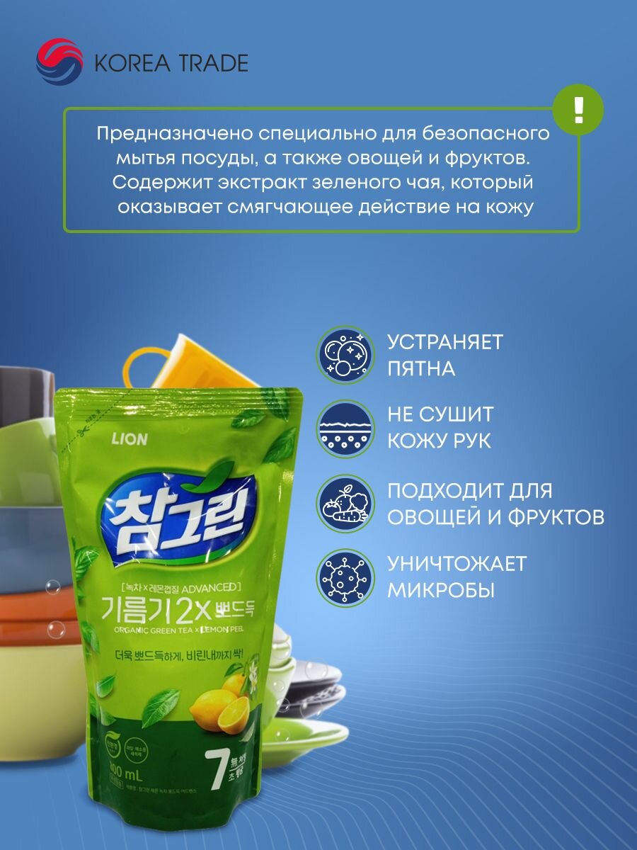 Средство для мытья посуды Lion Chamgreen Зеленый чай, мягкая упаковка с колпачком, 1.2 л
