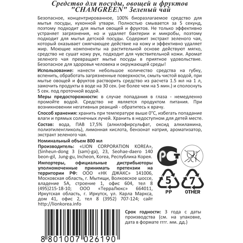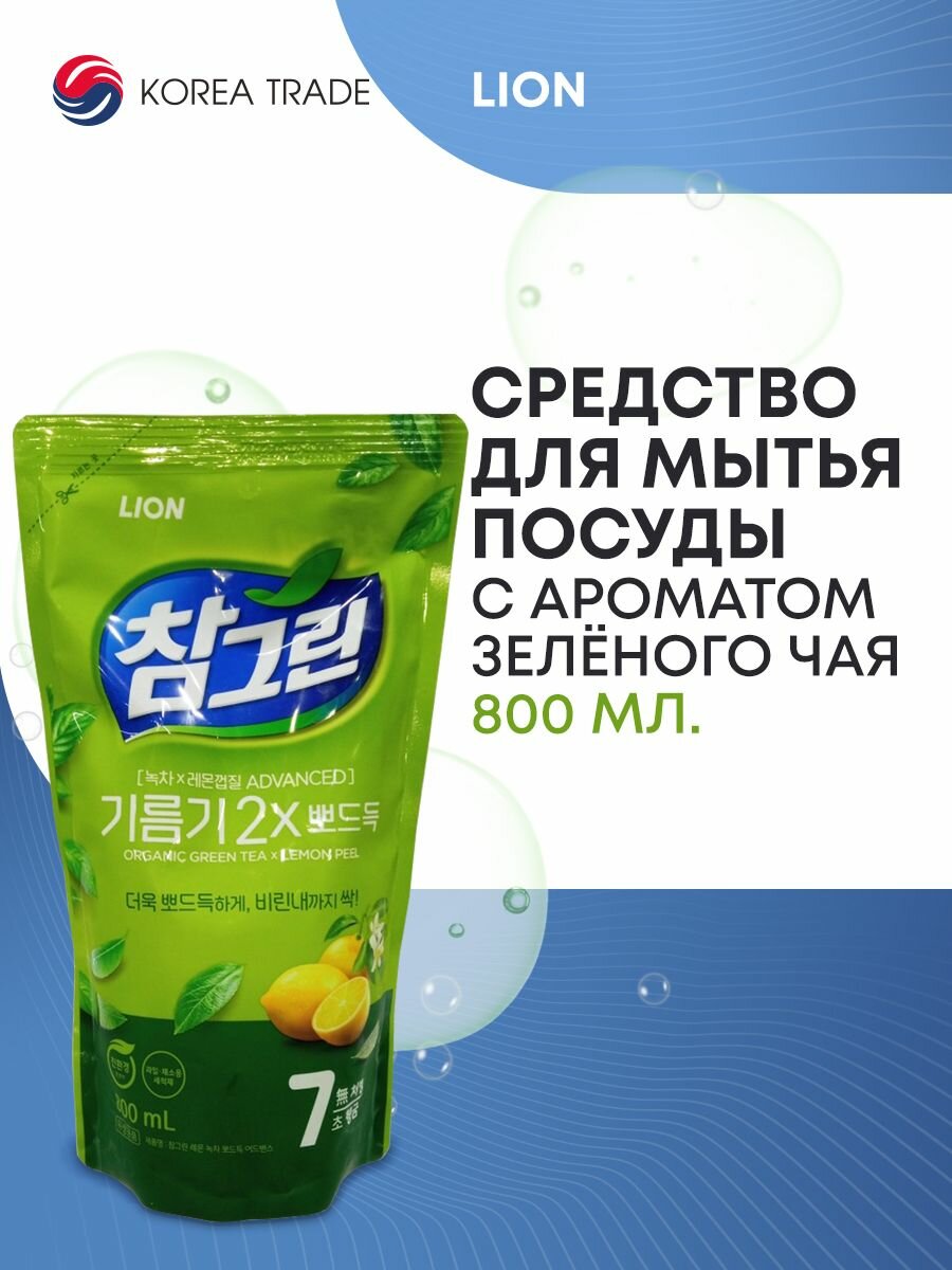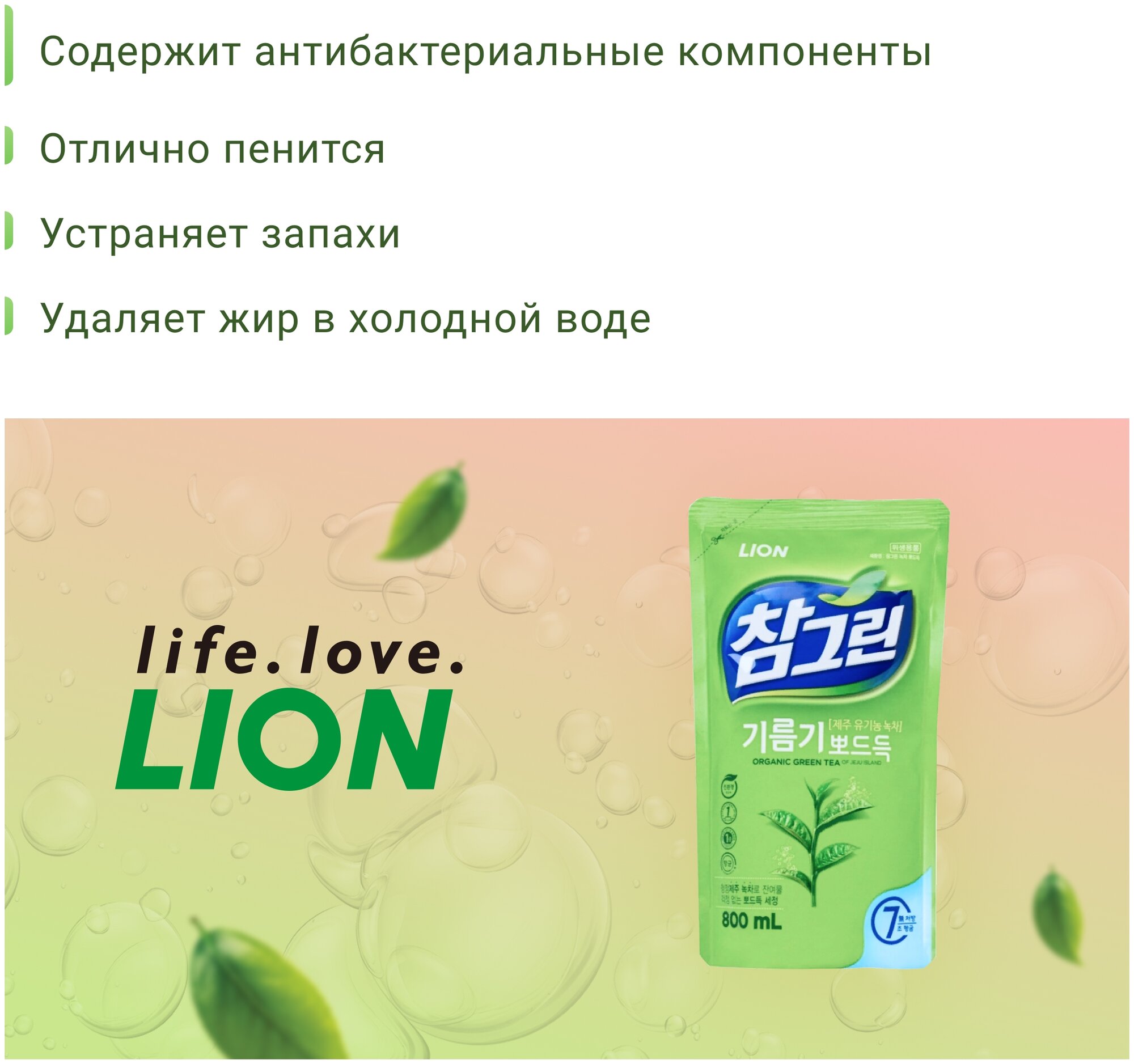 LION Chamgreen - Лион Жидкость для мытья посуды с ароматом зеленого чая, 800 мл -