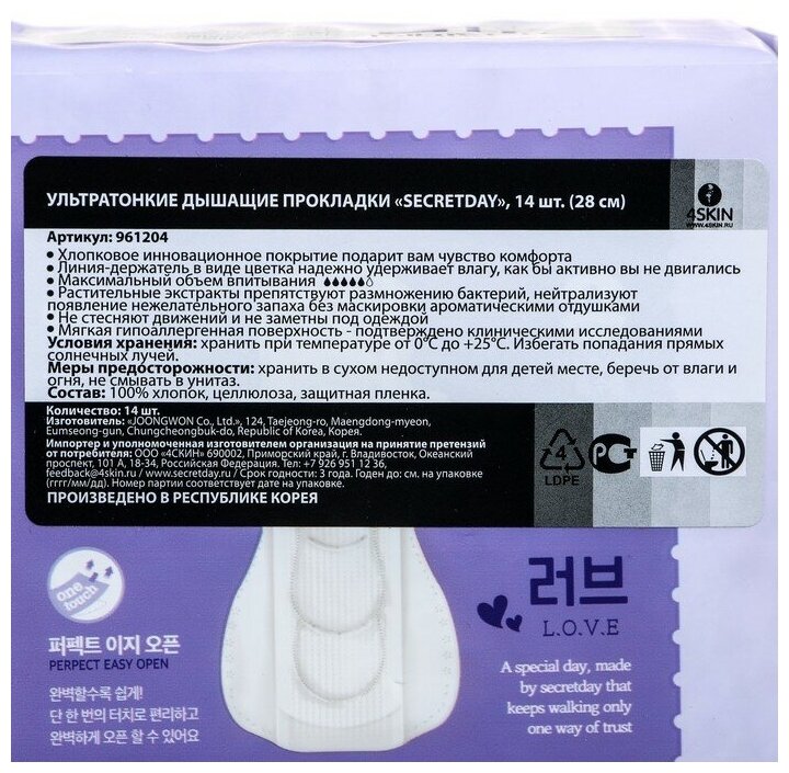 SECRETDAY LOVE Дышащие хлопковые прокладки (29 см) 14шт
